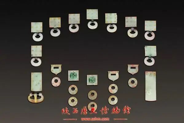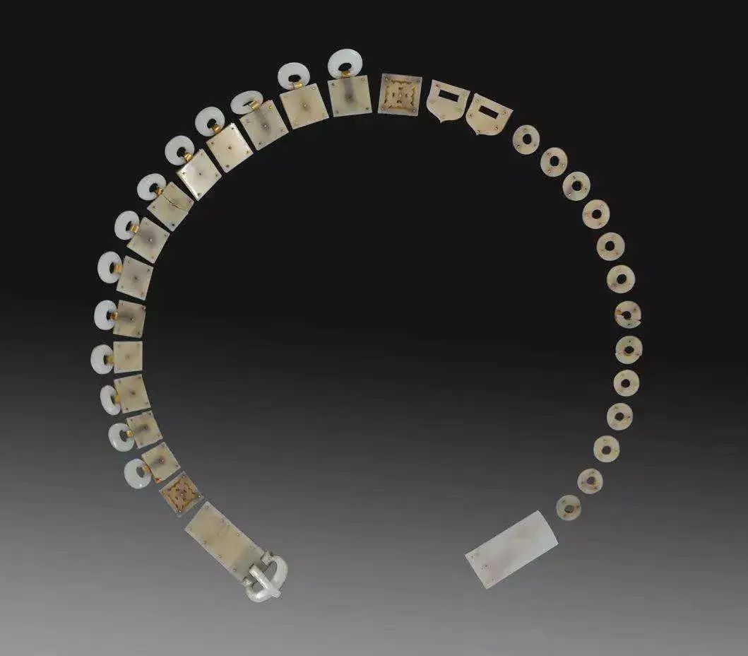 唐九环白玉蹀躞带是一组出土于唐代何家村窖藏的玉质带饰,收藏于陕西历史博物馆。共计二十五件套,除带扣外,每个构件上还附有金钉和鞓,可断定为实用品。蹀躞带这种装备最初来自西域游牧民族,后传入中原。环数的多少表示主人的地位尊卑,镶嵌物的质地和多少显示其身份。![]()