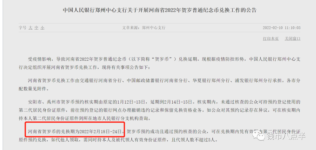 2月10日,中国人民银行郑州中心支行发布公告,河南省的虎年纪念币2月18日开始兑换,具体公告如下所示: