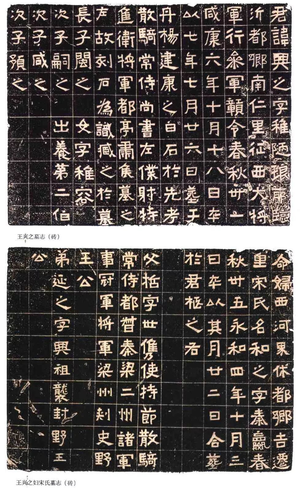 王兴之墓志、王兴之妇宋氏墓志《王兴之夫妇墓志》(图四、五),以今年(1965年)一月十九日出土于南京新民门外人台山,一石两面刻字。一面的刻字是:君讳兴之,字稚陋。琅耶临沂都乡南仁里。征西大将军行参军,赣令。春秋卅一。咸康六年十月十八日卒。以七年七月廿六日葬于丹杨建康之白石,于先考散骑常侍、尚书左仆射、特进卫将军、都亭肃侯墓之左。故刻石为识,藏之于墓。命妇西河界休都乡吉迁里,宋氏名和之,字秦嬴,春秋卅五。永和四年十月三日卒。以其月廿二日,合葬于君柩之右。父哲,字世俊,使持节散骑常侍、都督秦梁二州诸军事、冠军将军、梁州刺史、野王公。弟延之,字兴祖。袭封野王公。兴之虽未著姓,南京市文物保管委员会的同志们考证为王彬之子,是确切不可易的。《晋书》卷七十六《王彬传》云:“彬字世儒,……与兄俱渡江。……豫讨华轶功,封都亭侯。……苏峻平后,改筑新宫,彬为大匠。以营创勋劳,赐爵关内侯,迁尚书右仆射。卒官,年五十九。赠特进卫将军,加散骑常侍,谥曰肃。长子彭之嗣,位至黄门郎。次彪之,最知名。”王彬是王正的第三子,其长兄为廙,次兄为旷。旷即王羲之的父亲。王氏的原籍是琅琊临沂,郡望既合,年代亦无不合。其他和石刻中所述有关“先考”的爵位、官职、谥号,也都相符。晋成帝咸康六年为公元三四0年,兴之年三十一岁,则当生于晋怀帝永嘉三年,公元三0九年。东晋以三一七年成立,他是在童年时代,随着父兄南渡的。王彬之子除彭之、彪之外,据《世说新语·人名谱》,尚有一人名翘之,曾任光禄大夫。今又有兴之,足见王彬有子四人,而不是仅仅两人了。“征西大将军”应是庾亮。《晋书·庾亮传》:(成帝咸和九年公元334年)“陶侃薨,迁亮都督江、荆、豫、益、梁、雍六州诸军事,领江、荆、豫三州刺史,进号征西将军。”“行参军”者,据《隋书·百官志》在左右卫、左右武卫、左右武侯各大将军之下都有行参军,是比较低级的属吏。左右卫、左右武侯各六人,左右武卫各八人。隋制盖因袭晋制。庾亮以咸康六年正月卒,先于王兴之之死半年以上。王兴之盖先为庾亮的行参军,后升为赣县县令。赣县在晋属江州南康郡。王羲之亦曾参庾亮军,是则兴之与羲之,不仅是从兄弟,而且还曾经共事。兴之小羲之三岁。有人拟议:《兴之夫妇墓志》,可能是王羲之所书。考虑到羲之与兴之的关系,更考虑到《兴之墓志》只书名而不着姓,显然是王家的亲人自己写的,王羲之为兴之夫妇写墓志的拟议,看来不是毫无根据的。然墓志中称谓是从写作者的身分出发,如称兴之为“君”,称兴之妇为“命妇”。《兴之墓志》中称王彬为“先考”,可见写墓志的人是兴之的胞兄弟,即当于彭之、彪之、翘之三人中求之。三人中究为那一人虽无法断定,但墓志非王羲之所书则是可以断定的。当然,先考的称谓,有时只就墓主的身份而言。如北魏元诱妻薛伯徽墓志云:“先考授以礼经”(见《汉魏南北朝墓志集释》图版一三八),又唐吕岩诜撰张轸墓志云:“先考漪朝散大夫箸作郎”(见《八琼室金石补正》五十四卷29页),即其证。然在《兴之妇墓志》中,宋和之的亡父,却只称为“父”而不称“先考”,可见书属墓志者在称谓上是有所区别的。故《兴之墓志》中之“先考”,不仅单就兴之而言,实表示书属墓志者与王彬亦有父子关系。建康即今之南京,在晋属丹阳郡。原名秣陵,汉献帝建安十六年所置。孙权改为建业。晋武帝时复为秣陵。太康三年分秣陵之水北为建业。后避愍帝讳,改称建康。《晋书·职官志》:“散骑常侍,本秦官也。秦置散骑,又置中常侍。散骑,骑从乘舆车后。中常侍,得入禁中。……魏文帝黄初初置散骑,合之,于中司掌规谏,不典事。……至晋不改,及元康中,惠帝始以宦者董猛为中常侍,后遂止,常为显职。”“仆射,服秩印绶与〔尚书〕令同。案汉本置一人,至汉献帝建安四年,以执金吾荣邰为尚书左仆射。仆射分置左右,盖自此始。经魏至晋迄于江左,省置无恒。置二,则为左右仆射。或不两置,但曰尚书仆射。〔尚书〕令缺,则左为省主。若左右并缺,则置尚书仆射以主左事。”又“特进,汉官也。二汉及魏晋以加官从本官车服,无吏卒。”看来是官上加官的意思。卫将军有左右,职位颇高。根据《晋书·王彬传》的叙述看来,王彬是以尚书左仆射为本官,特进卫将军和散骑常侍都是死后的官上加官。王彬的地位在当时是相当显要的。关于“第二伯”的问题,南京文管会的同志们有独到的见解。他们注意到《世说新语·轻诋篇》中的一项重要资料。“王右军在南,丞相(王导)与书,每叹子侄不令。云:虎豚、虎犊,还其所如(还象个样子)。”此下注云:虎豚,王彭之小字也。《王氏谱》曰:彭之字安寿,琅琊人。祖正,尚书郎。父彬,卫将军。彭之,仕至黄门郎。虎犊,彪之小字也。彪之字叔虎,彭之第三弟。年二十而头须皓白。时人谓之“王白须”。少有局干之称。累迁至左光禄大夫。文管会来函云:“考注中彪之为彭之第三弟,又字叔虎,如版本无误,彭之尚有一第二弟。抑即翘之,或另有其人,早卒或无后,故以嗣之过继。”这说法是正确的。版本可无问题,日本金泽文库藏宋本、四库丛刊影印明本均作“第三弟”。我意,翘之当即第二弟,兴之则是第四。此可补《晋书·王彬传》的简略。又王彪之长兴之五岁,活到孝武帝太元二年(公元