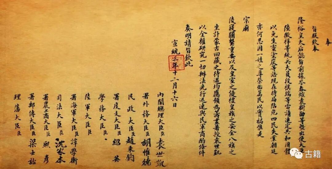 前稿全貌显示,它是袁内阁合签注、签批、修改文字于一体的工作本,而其供作依据的文本,即是退位诏书稿原文。足见前稿这篇退位诏书文本,其来历非同一般。此其二。