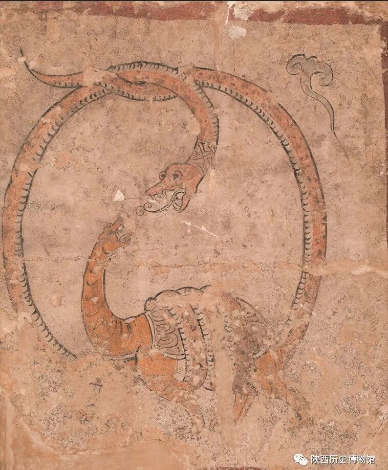 图中龟足壮颈长,行走有力。蛇体在龟腹前后足之间缠绕三匝,头与尾向上高扬呈环状在上部交叉。蛇、龟口大张,怒目圆睁相互对视。笔法流畅,形象生动,是唐墓壁画中保存完整的玄武图。