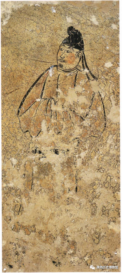 墓甬道长近7米,东壁、西壁对称地以单体平列式的构图方法分别安排了七至八个男女人物。此图位于西壁第五。男侍头戴黑色幞头,身着圆领袍衫,腰系黑革带,足穿黑靴,双手相拢于腹前,神态安然。
