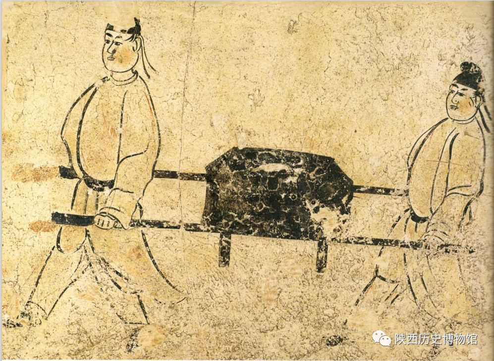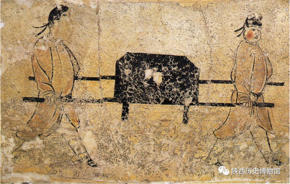 苏思勖墓甬道东壁、西壁对称地分别安排了一组二人抬箱图。画面中两位男子头系幞头,身着圆领袍衫,腰系黑色革带,足穿黑靴,正抬着一个长方形黑色的箱子,步履匆匆地向着墓主人所在的墓室行进。两位男子所穿的圆领袍衫,两侧下摆开叉直至腰胯处,因此将这种袍衫叫做“缺胯衫”,也有的称缺胯袍、缺骻袍。缺胯衫属胡服系统,出现于北周时期,可能是接受西域、波斯的影响之后形成的。