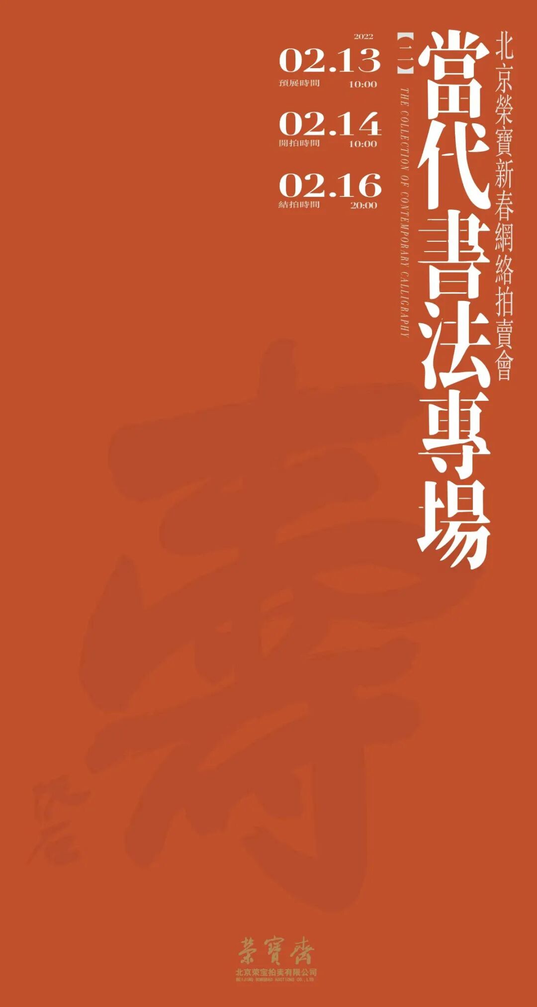 北京荣宝新春网络拍卖会·当代书法专场(二)将于2月13日10:00—2月14日10:00开启线上预展,并于2月14日10:00开拍,2月16日20:00结拍。