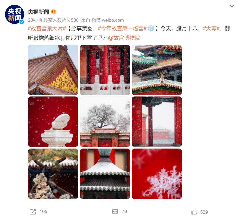 1月20日,大寒,北京飘雪。#下雪故宫#登上热搜。