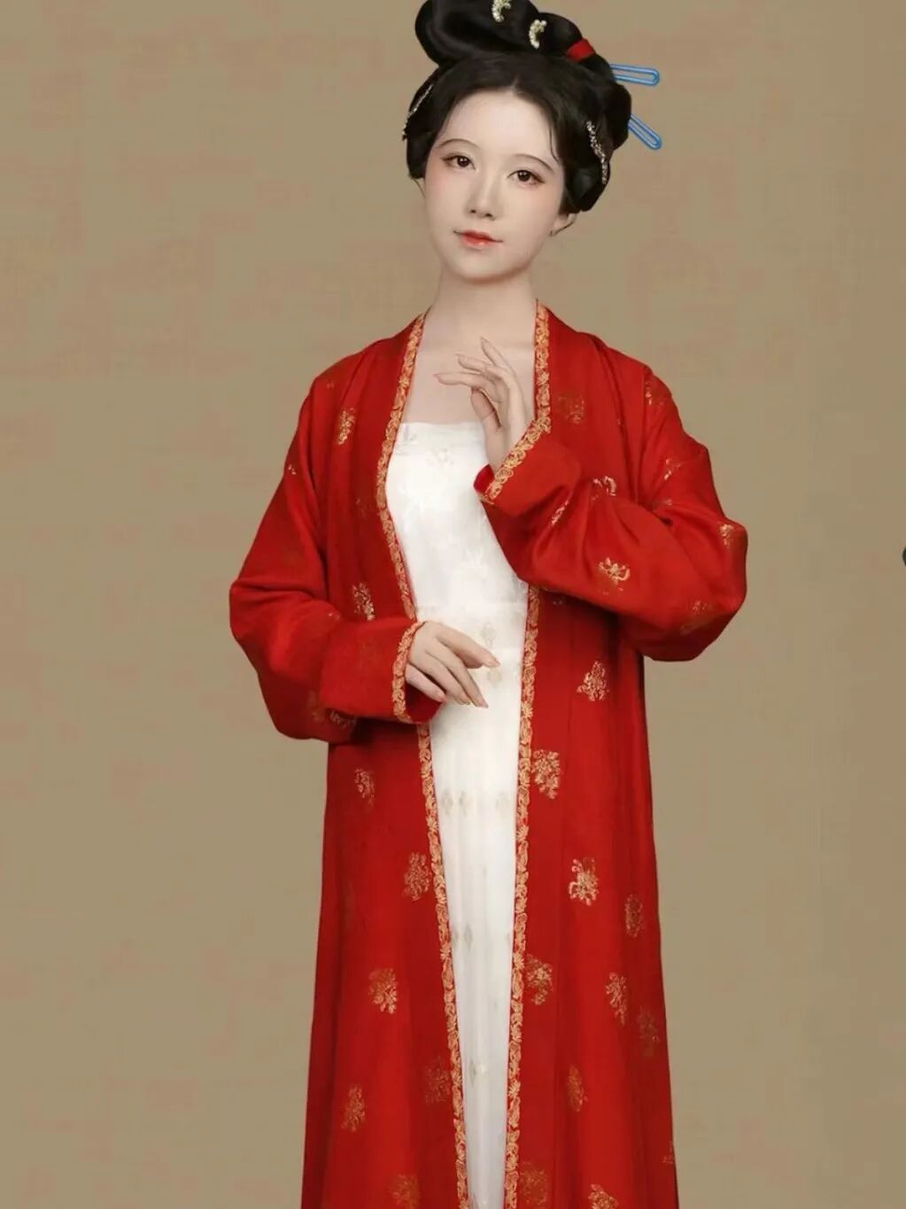 于是唐大袖衫应运而生。它的学名叫披衫,直领对襟,两侧开叉,袖子宽大到抱在胸前都能垂到小腿,看起来夸张而慵懒。