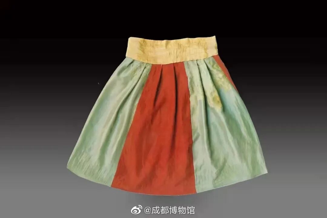 也许是因为把裙子露了出来,交窬裙的颜色也变得多样起来,像上面这这条文物复原款间色裙就是使用了大胆的红绿撞色,上襦则是紫色,又端庄又时髦。
