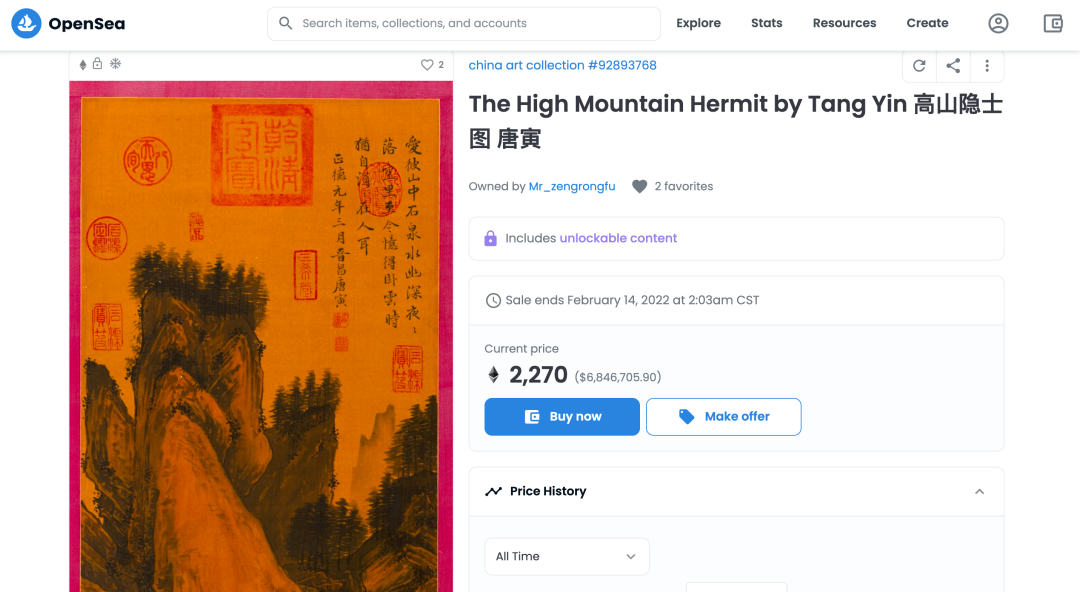 甚至如果你愿意,还能在数位世界里把这份NFT版本拍卖掉,就像曾国藩的后裔、唐寅《高山隐士图》的拥有者目前就把此画的NFT版本挂在了全球最大的NFT交易平台opensea上出售。