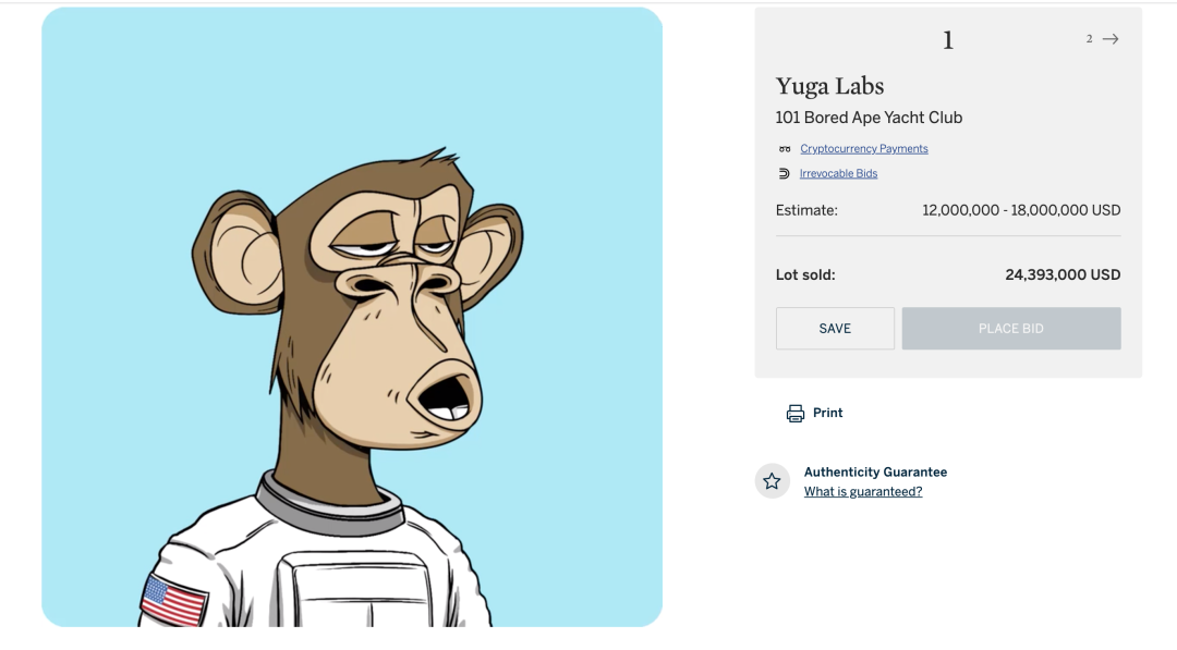 苏富比紧随其后在9月的拍卖中出售了一组“无聊猿”卡通NFT,成交价约2440万美元。