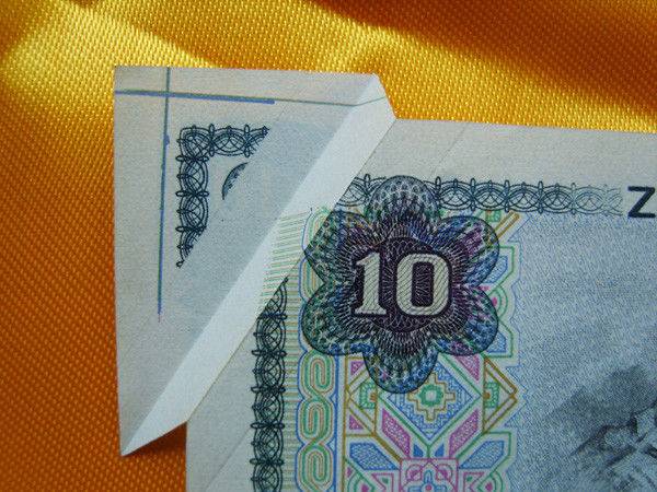 3、用真币裁掉一个小角,然后揭层,造成折角漏白的福耳。