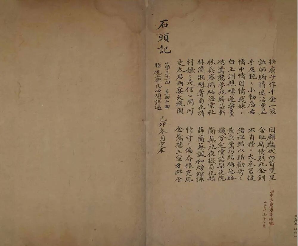题《脂砚斋重评石头记》,书内题有“己卯冬月定本”,一般认为“己卯” 为乾隆二十四年(1759)。该本为乾隆年间的弘晓(怡亲王)所抄藏。在此抄本中,“玄”“祥”“晓”等字均省去最后一个笔画。原存四十回,1959年又发现三整回并两个半回。