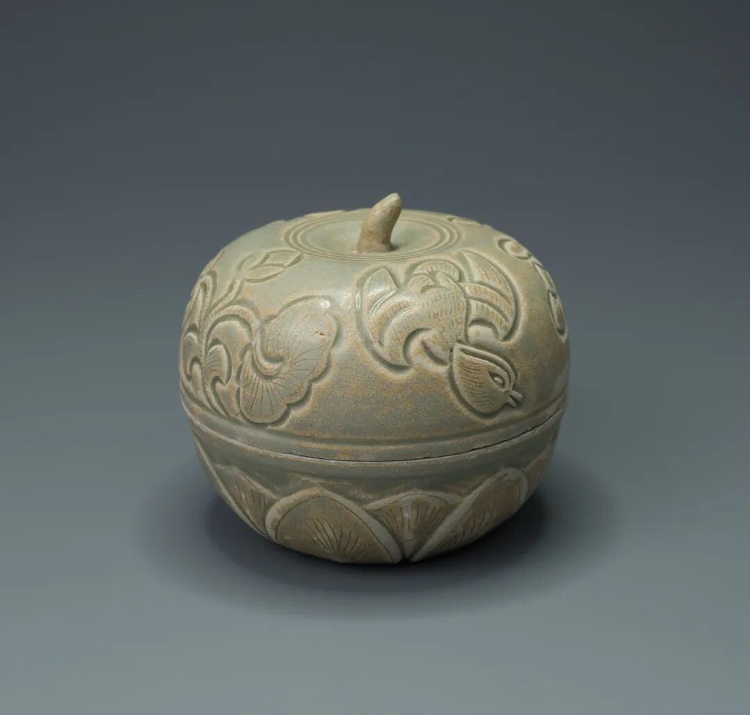 五代/北宋 越窑青瓷刻花鸳鸯莲瓣纹瓜形盖盒