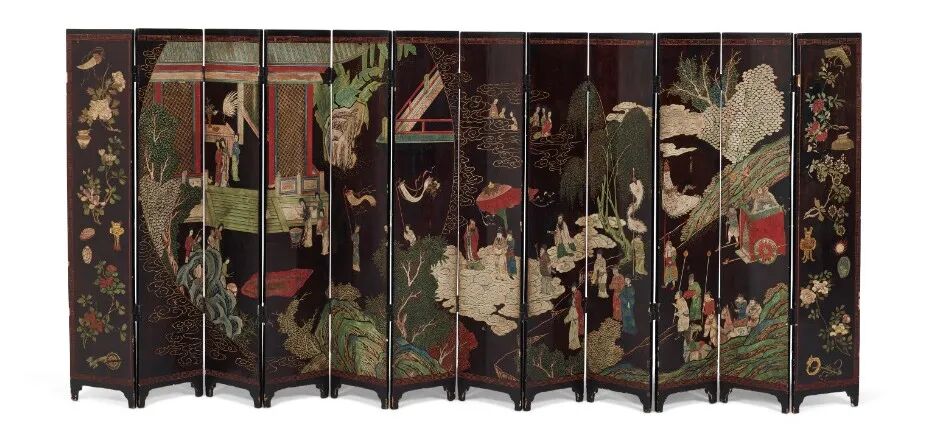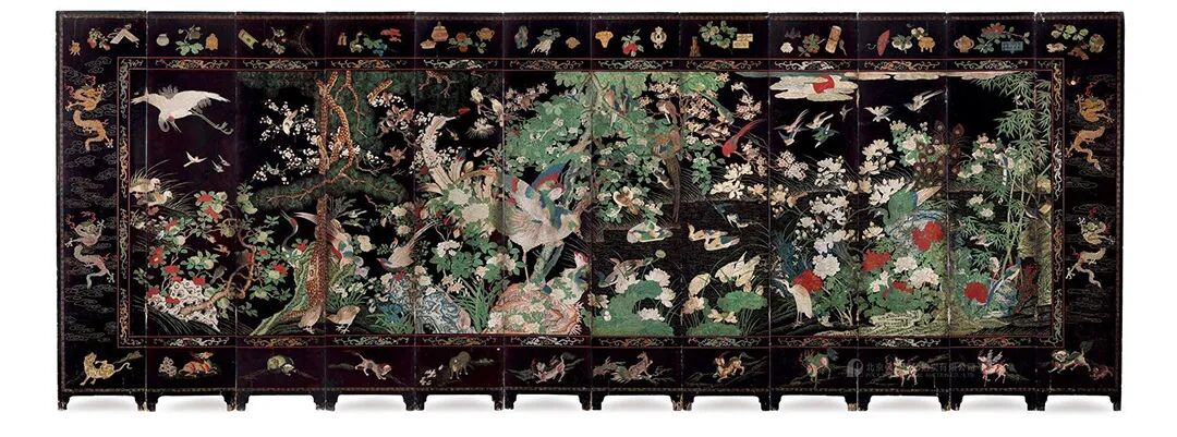 款彩工艺兴盛于明代晚期,到了清前期用款彩作大围屏的风气逐渐盛行,传世的八叠、十二叠款彩围屏多数是康熙时期的制品。屏风主题以山水花鸟、历史故事、庭院人物为主,放置于厅堂内,或群芳竞艳、百鸟争喧,营造欢腾繁盛的气氛;或清荣峻茂、松鹤鸣泉,洗涤尘心,别添几分雅趣。