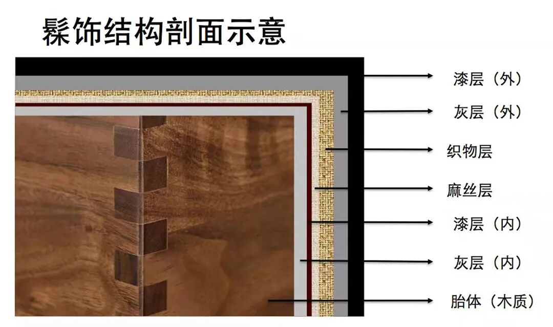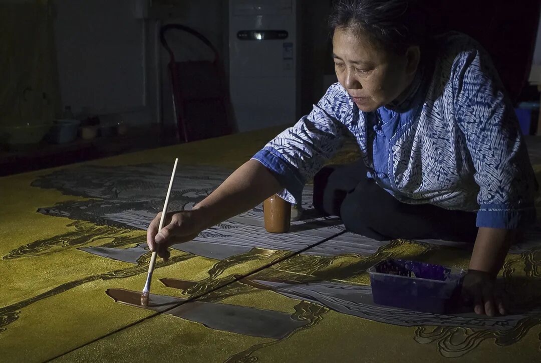 看似小编只言片语就概括完了款彩的工艺(其实只是没有勇气把全部工序铺开仔细讲),实际上款彩的工序繁多、工艺细致复杂,综合运用彩绘、填漆、戗金等髹漆技法。画面上林怡大师刀随意走,技法娴熟,那可是辛勤耕耘漆艺四十余年的成果。