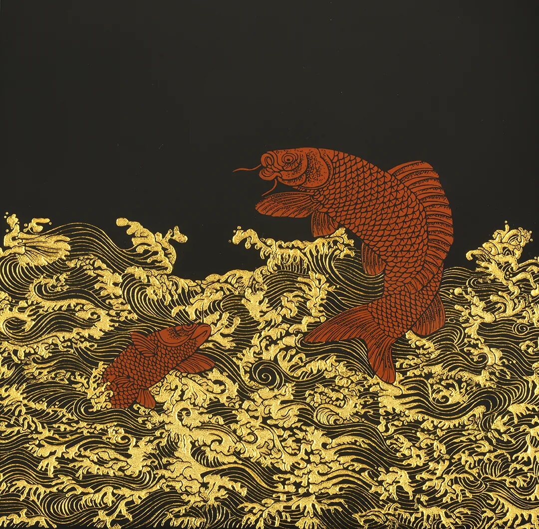 “吴下髹工巧莫比”,林怡大师传承苏州漆器制作技艺,尤以款彩及戗金技艺著称,一直努力展示漆艺与款彩之美,奉行“少而精、古而新”的宗旨,结合传统技法和现代审美,力创经典,让款彩这门手艺活在当下。她也试图将书法绘画作品用款彩工艺再诠释、再创造,以漆艺语言再现古人经典,如《曜鱼》漆盒就是根据宋人古画《曜鱼图》为基础进行的摹创,漆盒主要以雕填、戗金、砂金工艺为主,以黑色阳刻线条勾勒出水波的形状,水波为戗金技法,白浪覆螺钿细砂,均以金箔设色,随光线变化呈现律动,凸显波涛澎湃汹涌。
