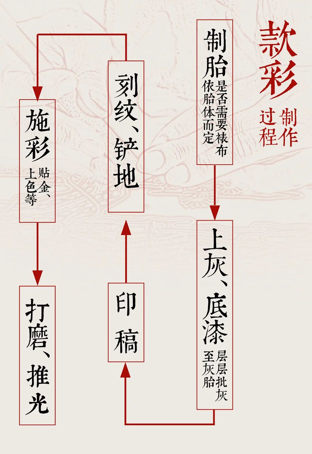 整体来说,款彩就是在灰面上刻出花纹轮廓,再将轮廓以内的漆灰剔去,填入各种漆色或油色等以及金或银等,好似一幅色彩丰富的图画。由于花纹轮廓略微高起,看上去很像印线装书的木板。