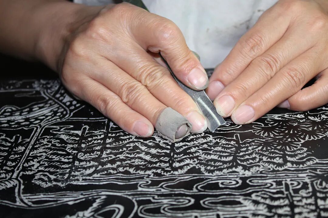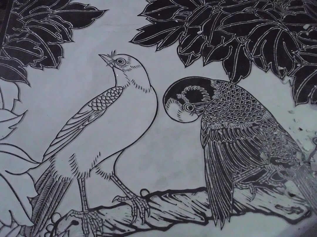 再用平口刀沿着轮廓将漆皮铲除,并按要求留出灰底。刻法有阴刻、阳刻、阴阳混刻。
