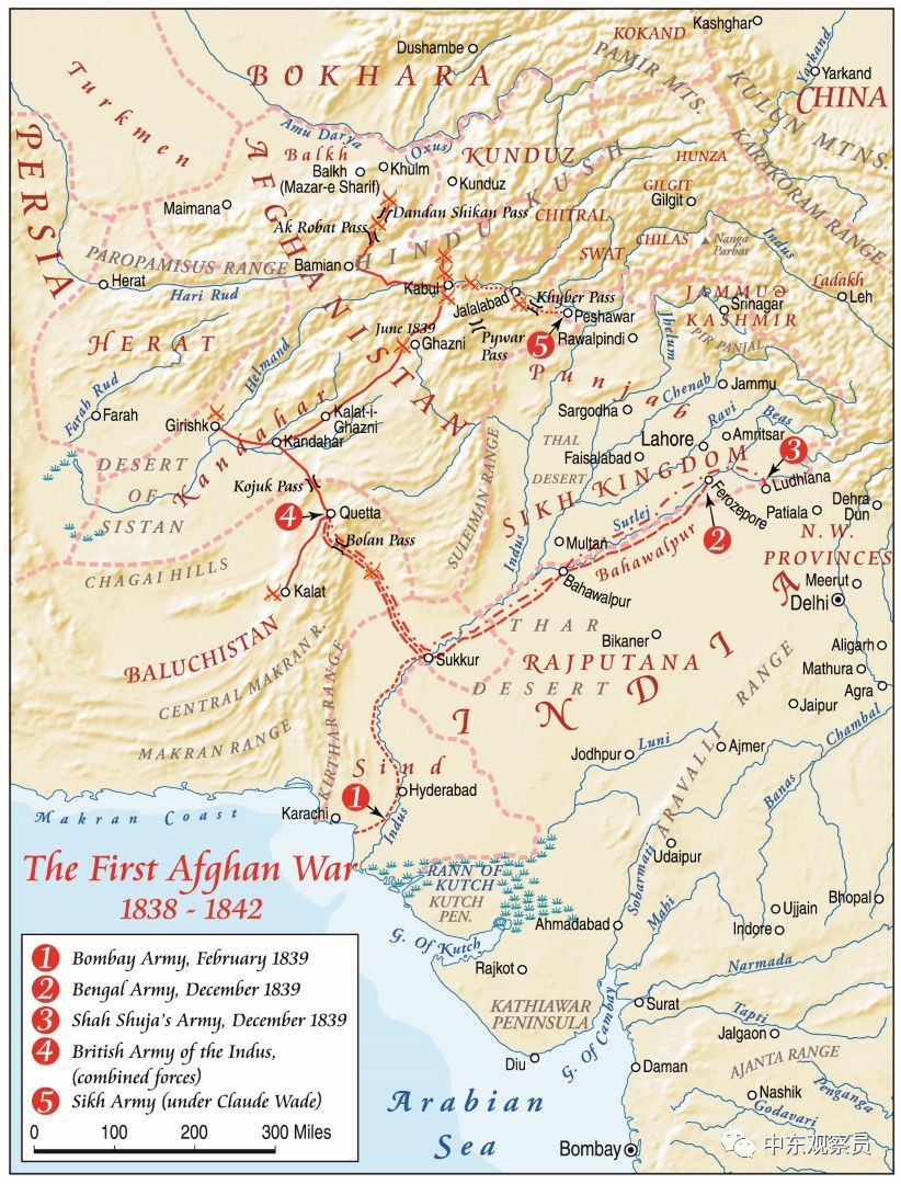 看到俄国的威望在阿富汗不断增长,英国向多斯特·穆罕穆德汗提出最后通牒。英国人强调了阿富汗对英国的依附,并贬低阿富汗人的民族自尊心。这种语调引发了多斯特·穆罕穆德汗和阿富汗贵族的厌恶。这一切导致了1838—1842年的第一次阿富汗战争。但第一次阿富汗战争只是给英国人带来了惨痛教训。之后英国人改变策略,收起对阿富汗政府咄咄逼人的态度,改为通过较为缓和的态度对阿富汗内部事务进行渗透。