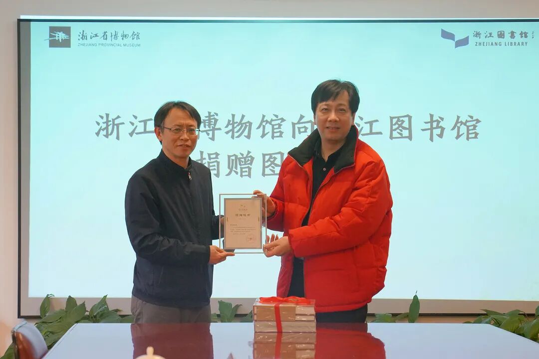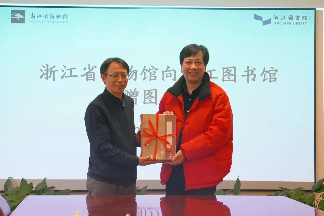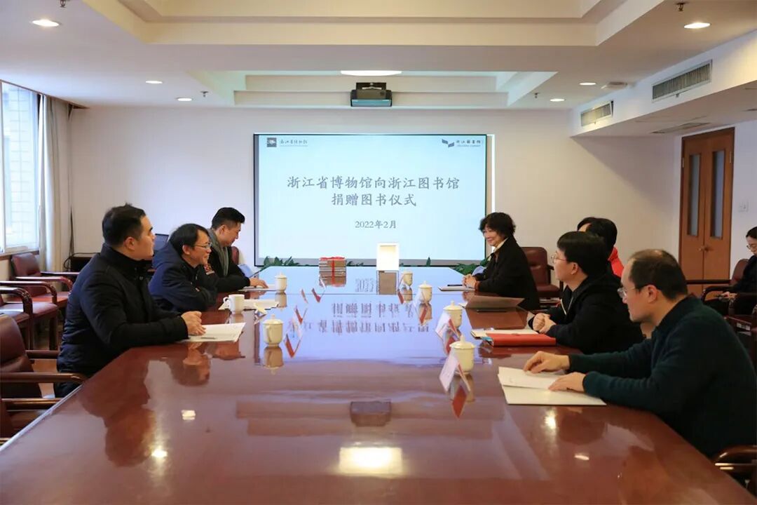 2月16日,浙江省博物馆向浙江图书馆捐赠图书仪式在浙江图书馆举行。浙江省博物馆党委书记、馆长陈水华,办公室主任高利祥,宣传与对外交流部主任施义亭;浙江图书馆党委书记、馆长褚树青,党政办公室主任毛炳聪,采编部主任屠雷激,地方文献部副主任童圣江参加捐赠仪式。