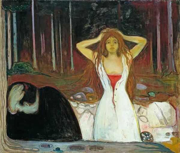 梵高终其一生,除了坚持艺术创作,也在探索“真爱”。不幸的是,梵高的每一场爱情故事都以悲剧收场。梵高自己也发出感慨:“生活是个谜,而爱情就是谜中谜”。画中的玛格丽特,是梵高生命中最后一次恋爱的姑娘。1890年5月,梵高来到距巴黎不远的小镇奥维尔接受加歇医生的治疗。加歇医生有个女儿叫玛格丽特,她非常理解和欣赏梵高,跟梵高一起散步,一起写生。加歇医生并不支持这段恋情,让玛格丽特有意疏远梵高,这段感情最终无疾而终。梵高去世后,玛格丽特经常去梵高墓前献花,她终生未嫁,卧室里挂了44年的,就是梵高为她作的《弹钢琴的玛格丽特》。画中,一头火红头发的吸血鬼女人看起来像是要从他身上抽干生命,而不是在拥抱她那脸色苍白的情人。这副画探索了一个相似的主题:一个女人强势地站在画布的中央,而一个男人则在衰弱的痛苦中畏缩在一旁。烧焦的木头把这两个人物联系在一起,暗指爱情的炽热消亡。挪威象征主义者爱德华·蒙克(Edvard Munch)经常深入挖掘自己的痛苦,并将其作为创作素材。疾病的痛苦、亲人的过早死亡是一些画作的灵感来源;另一些则从他一生中那些跌荡起伏的爱情故事中汲取灵感。![]()