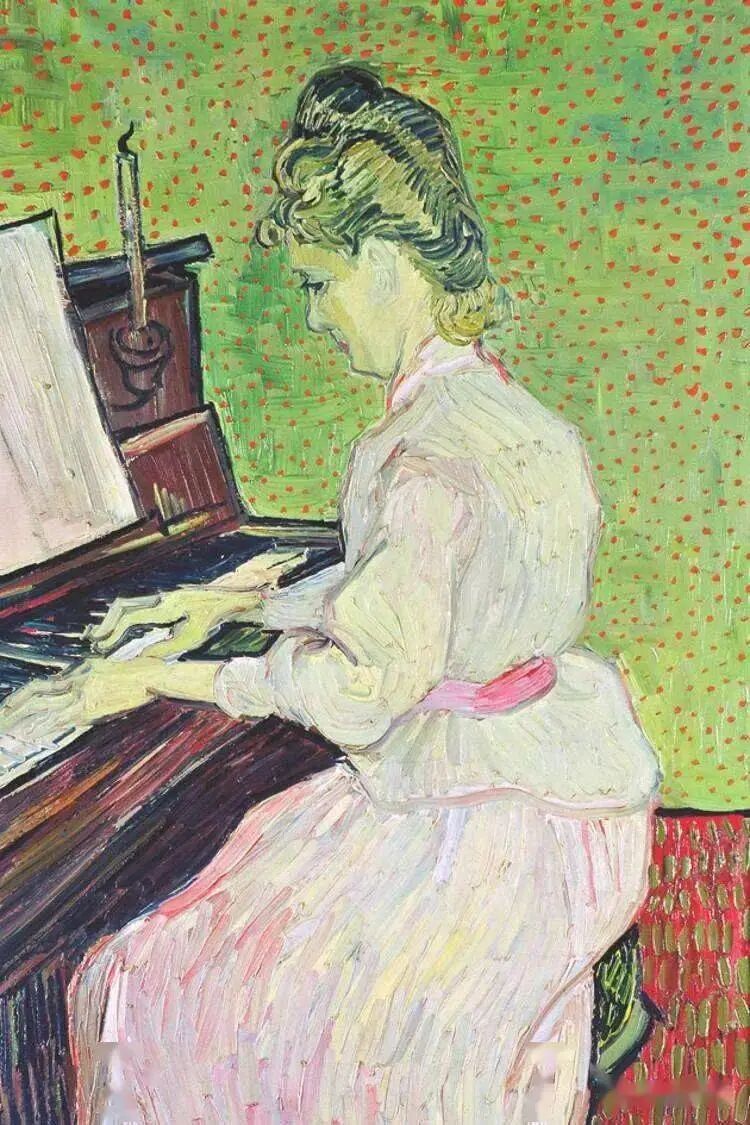 这幅画是文森特·梵高(Vincent Willem van Gogh)所有油画中最大的一幅,有三个梵高自画像那么大。画中的玛格丽特肤色白里透红,身材颀长,在布满花纹、由红绿两色组成的背景衬托下, 似乎在画面上活了起来, 而人物清晰的轮廓和竖长构图又使得着色酣畅的衣裙格外醒目。背景墙壁的淡绿和黄绿和少女粉色的衣裙形成补色关系,对比强烈;而墙上橙色的斑点,红底绿格竖向排列的短笔触的地毯,深紫色横向粗长笔触的钢琴,粉红色流动线条的长裙,这些不同的笔触和颜色具有强烈的象征性,形成梦幻般的场景。