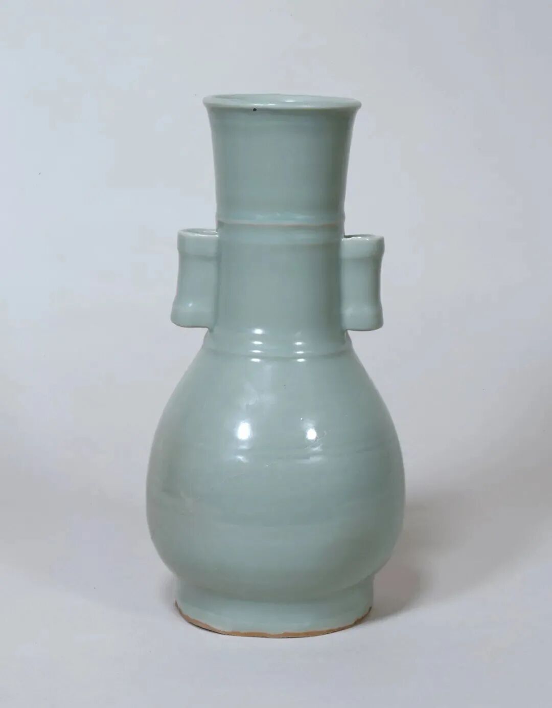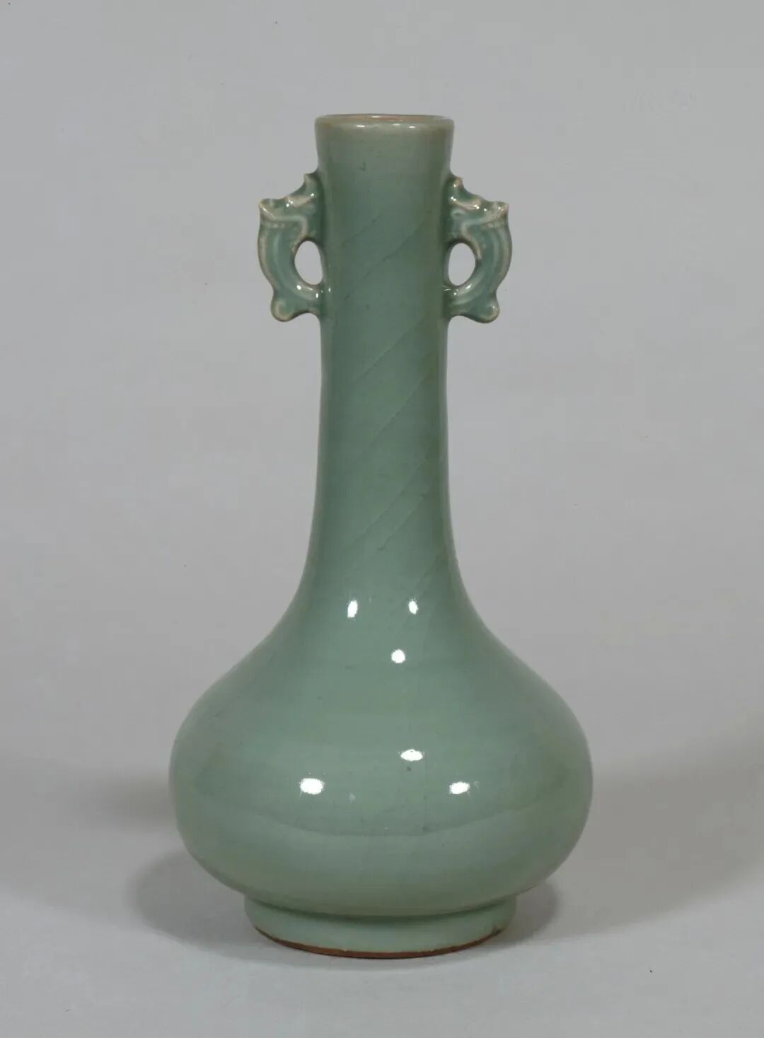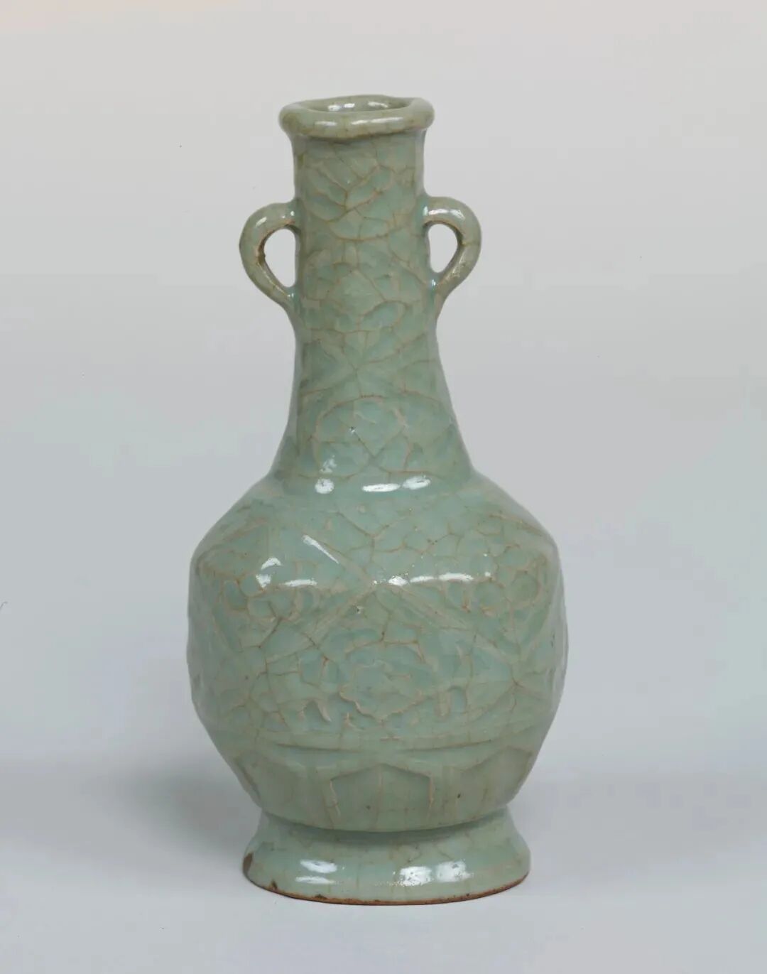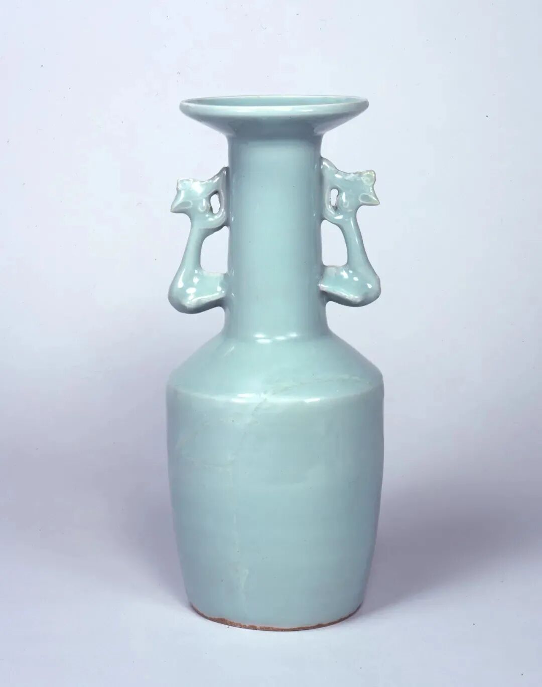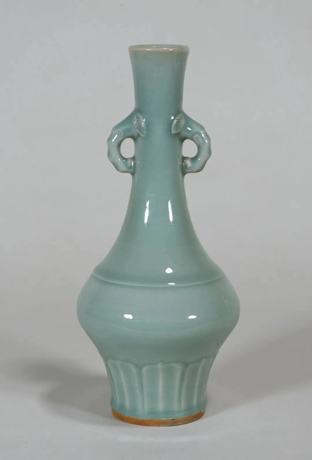 该器虽未标注年代,其时代特征鲜明,可视为元代龙泉烧制。其颈部中段以上被截去的现象,在土耳其伊斯坦布尔托普卡帕皇宫博物馆所藏的龙泉青瓷中亦多有所见,是当地根据本土饮食习俗及审美风尚对器物进行再加工和修饰所致,不过也有可能是被截去部分破损较严重所致。