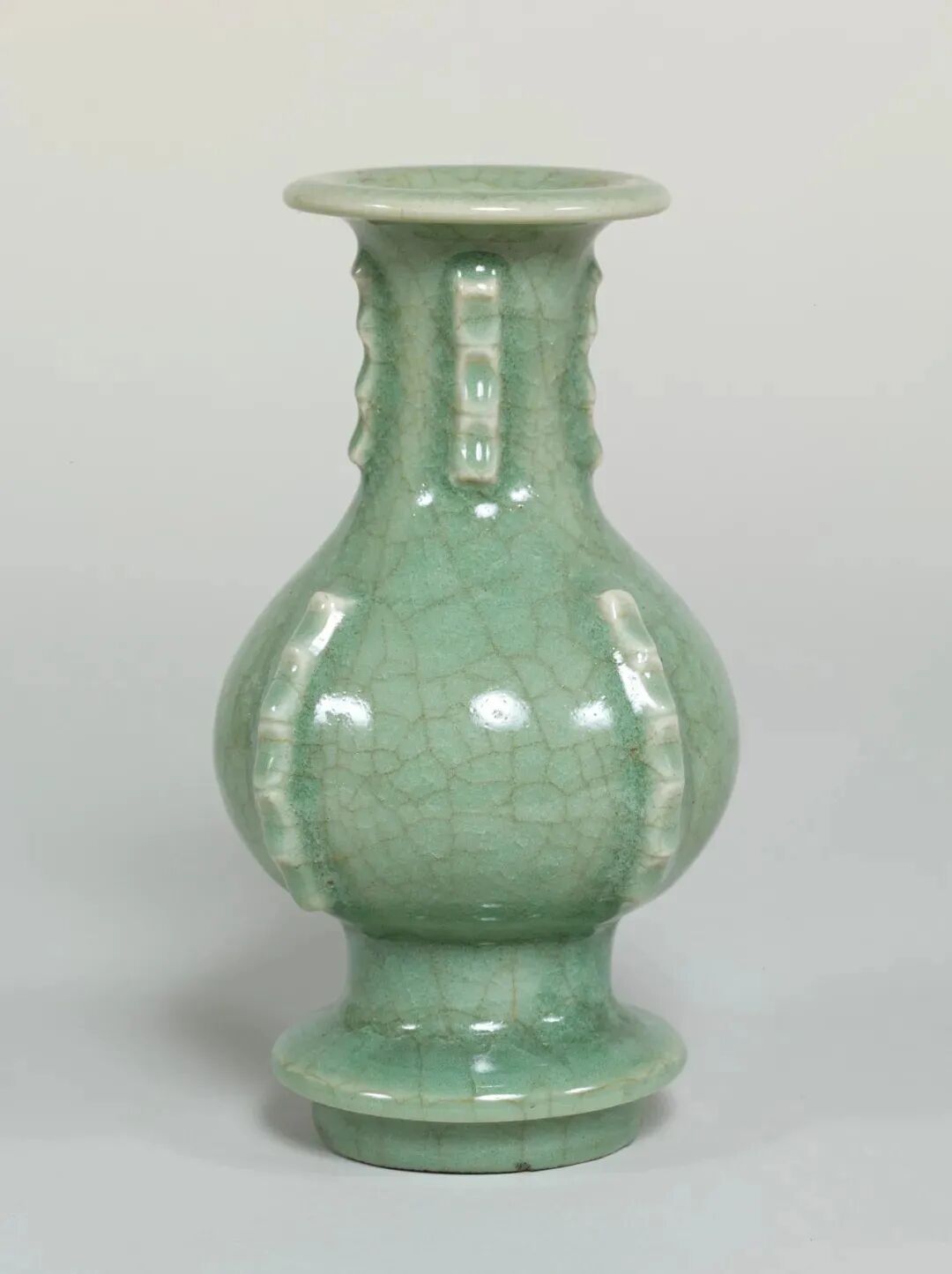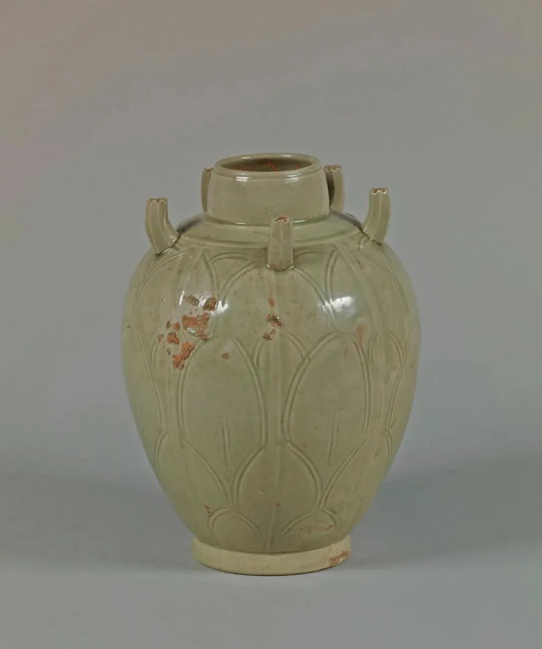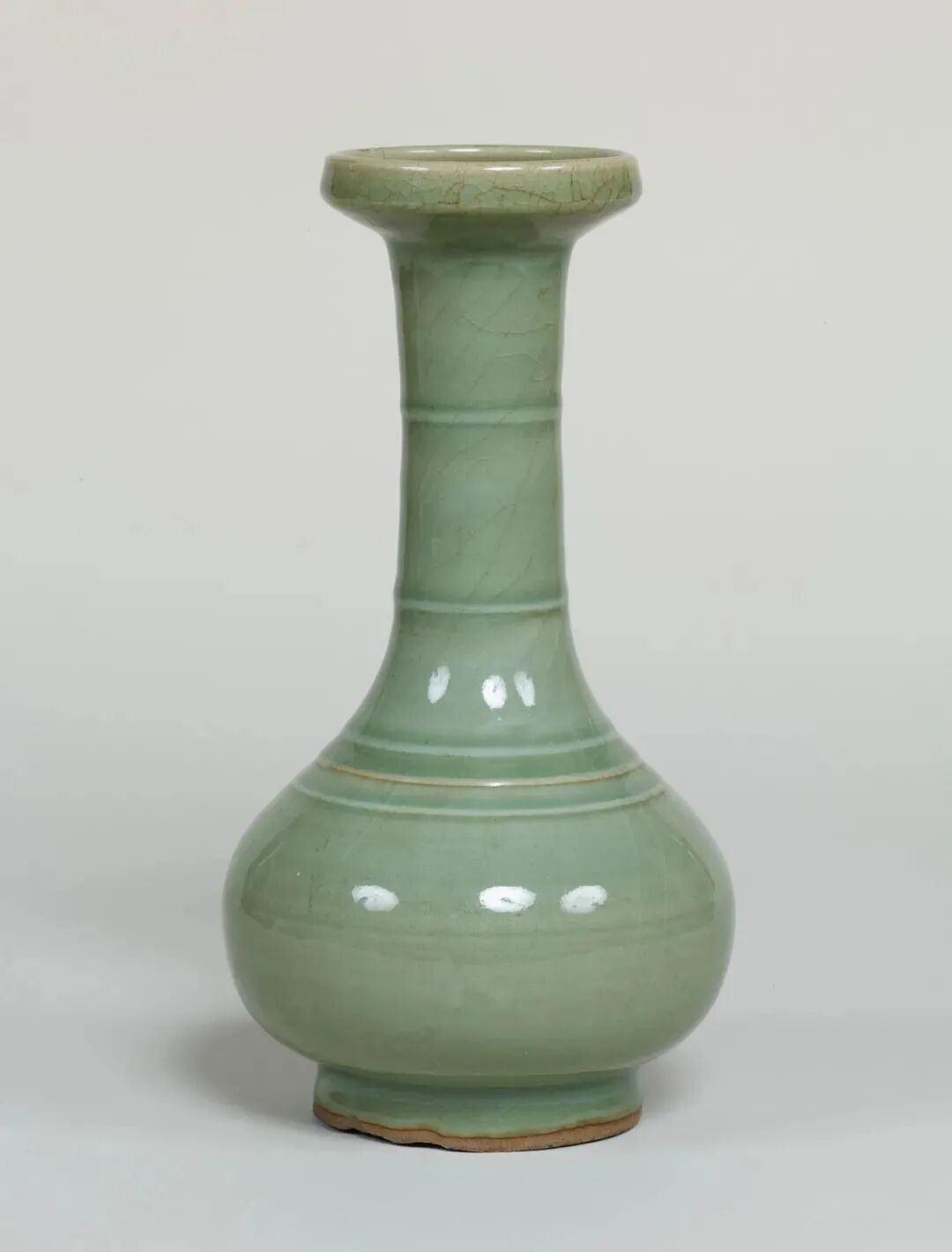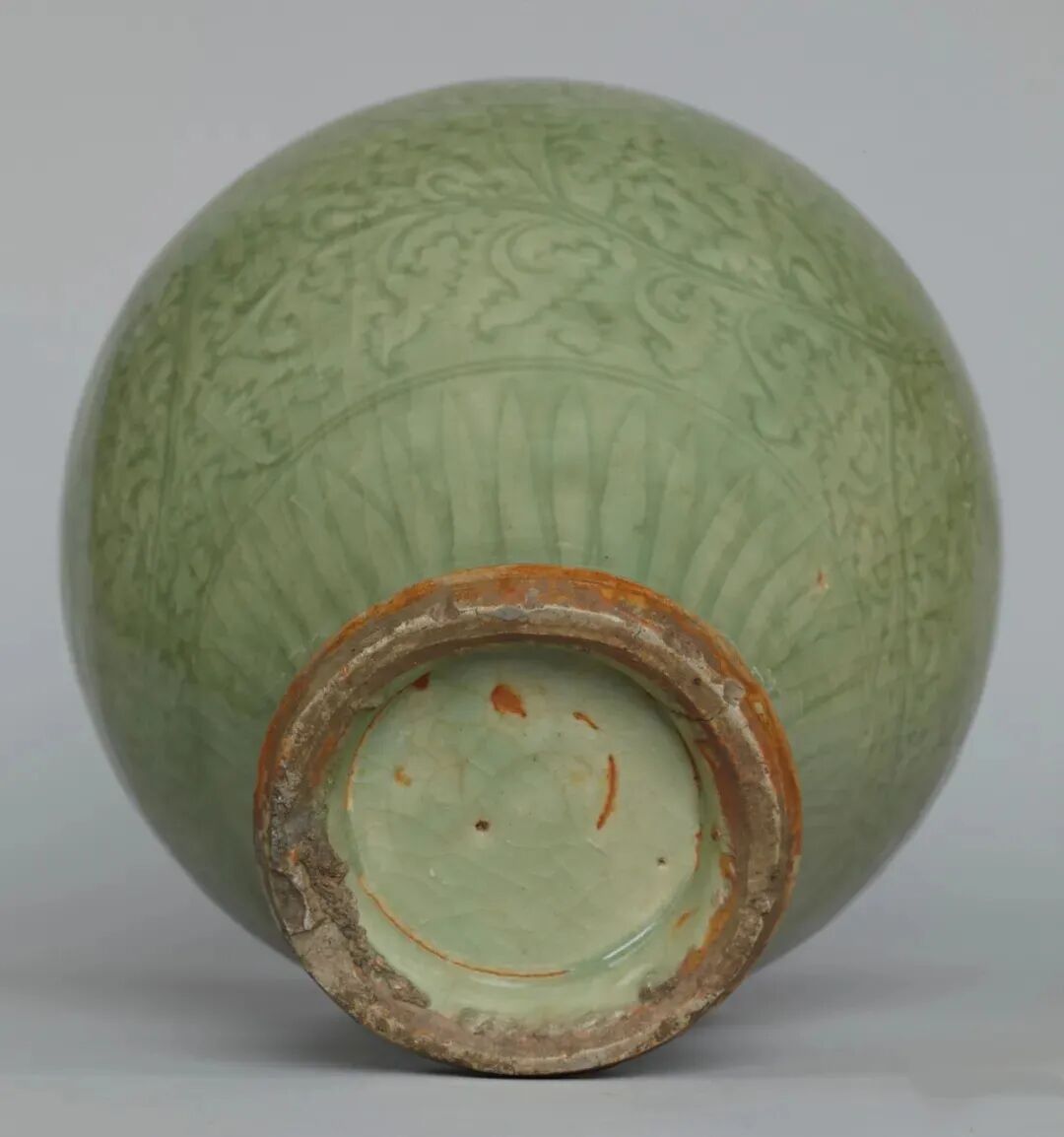 该器虽未标注年代,其时代特征鲜明,可视为元代龙泉烧制。其颈部中段以上被截去的现象,在土耳其伊斯坦布尔托普卡帕皇宫博物馆所藏的龙泉青瓷中亦多有所见,是当地根据本土饮食习俗及审美风尚对器物进行再加工和修饰所致,不过也有可能是被截去部分破损较严重所致。