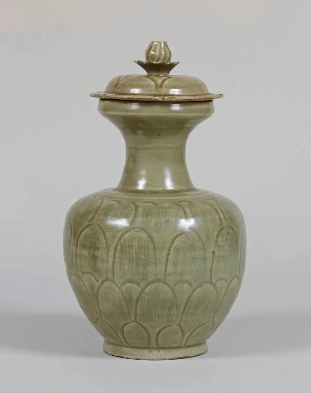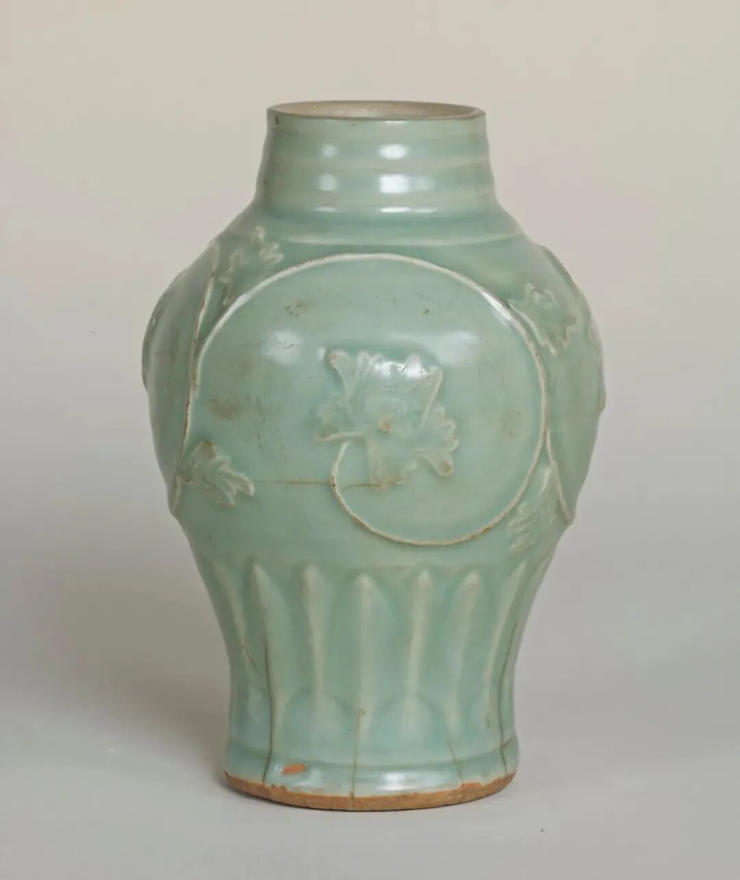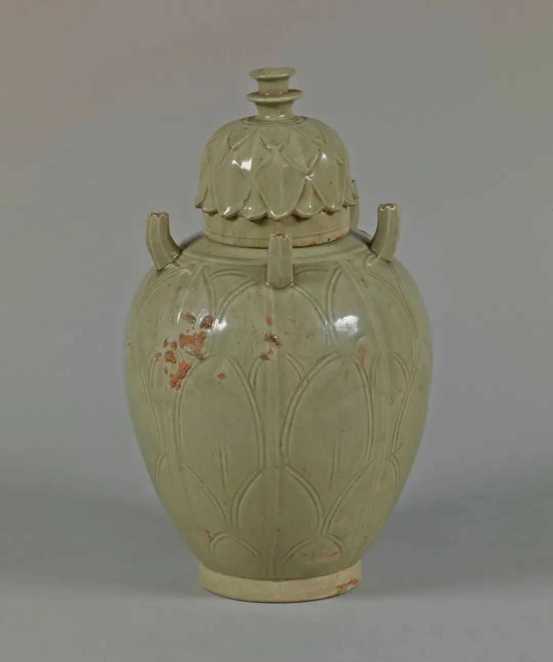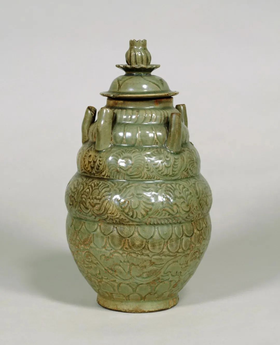 该器虽未标注年代,其时代特征鲜明,可视为元代龙泉烧制。其颈部中段以上被截去的现象,在土耳其伊斯坦布尔托普卡帕皇宫博物馆所藏的龙泉青瓷中亦多有所见,是当地根据本土饮食习俗及审美风尚对器物进行再加工和修饰所致,不过也有可能是被截去部分破损较严重所致。