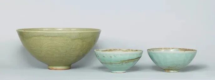 以上三件青磁碗均为昭和28年(1953年)于神奈川县镰仓市衣张山西麓的私宅庭院出土。根据当时的描述,表层土下有石板,石板下有倒扣的大碗,大碗中叠扣有2只小碗。此外未见其他文物。大碗为元代龙泉所烧(日人称之为天龙寺青磁大碗),形制巨大,施青中泛黄色釉,里外满工刻花,纹饰繁缛精美,十分罕见。两只小碗尺寸相近,系南宋龙泉窑常见的莲瓣纹碗,薄胎厚釉,工艺精湛,粉青釉温润柔美,虽有土蚀痕迹,瑕不掩瑜。这两种碗虽同时埋藏于一处,但是否为同一时期舶至日本则不得而知。