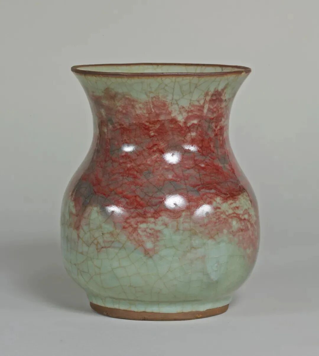 此器未标注年代和窑口。据其胎釉及工艺特征分析,笔者认为系元代龙泉烧制,且为龙泉核心产区大窑一带产品。关于龙泉铜红斑,笔者曾有专文论述,本品红斑面积较大,铜红呈色鲜艳,是难得一见的铜红斑精品器例。