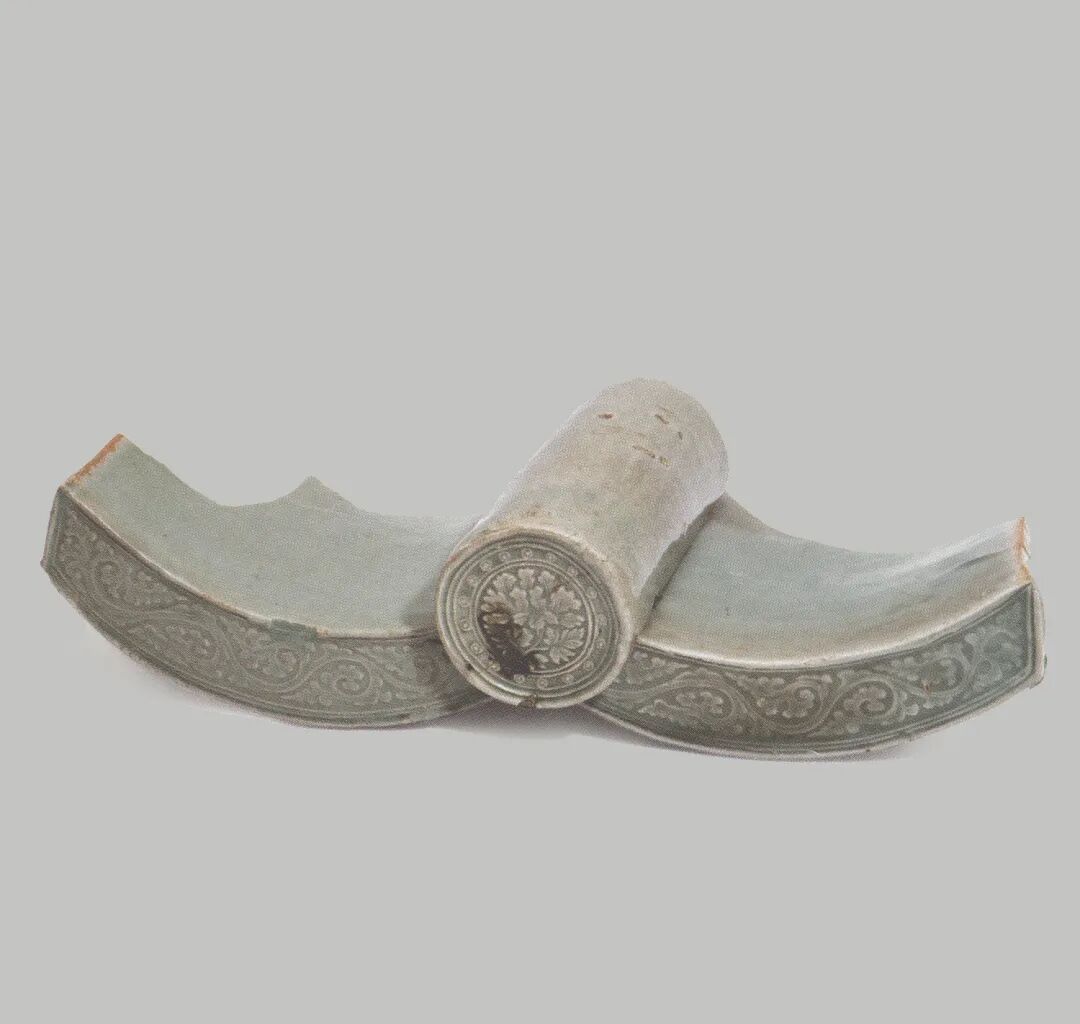 但它们都是带黑白双色复合彩的精致型镶嵌青瓷。韩国学者认为镶嵌青瓷的创制时间会早到12世纪中叶以后,其代表是一些仅在局部有镶嵌装饰的器物,如一件腹部是刻花,仅在口部镶嵌雷纹的碗[图七]和一件通体饰刻花装饰、仅在局部用黑彩镶嵌诗文的葫芦形瓶[图八]。徐兢于宣和五年(1123年)出使高丽,所见所闻均有详细记录,而未记镶嵌青瓷。高丽仁宗(1133-1146年)长陵中出土了许多翡色青瓷,十分精美,但未见镶嵌青瓷[图九],说明12世纪镶嵌技术还没出现或至少还不成熟。1964-1965年韩国国立中央博物馆发掘康津沙塘里窑址,出土了一些青瓷瓦[图十],在筒瓦瓦当的边部有两组双环纹夹着一圈小圈点纹,采用了镶嵌的工艺[图十一],整器的主体装饰是刻花,仅在很小的局部采用了镶嵌工艺,带有非常明显的镶嵌装饰肇始的特征。