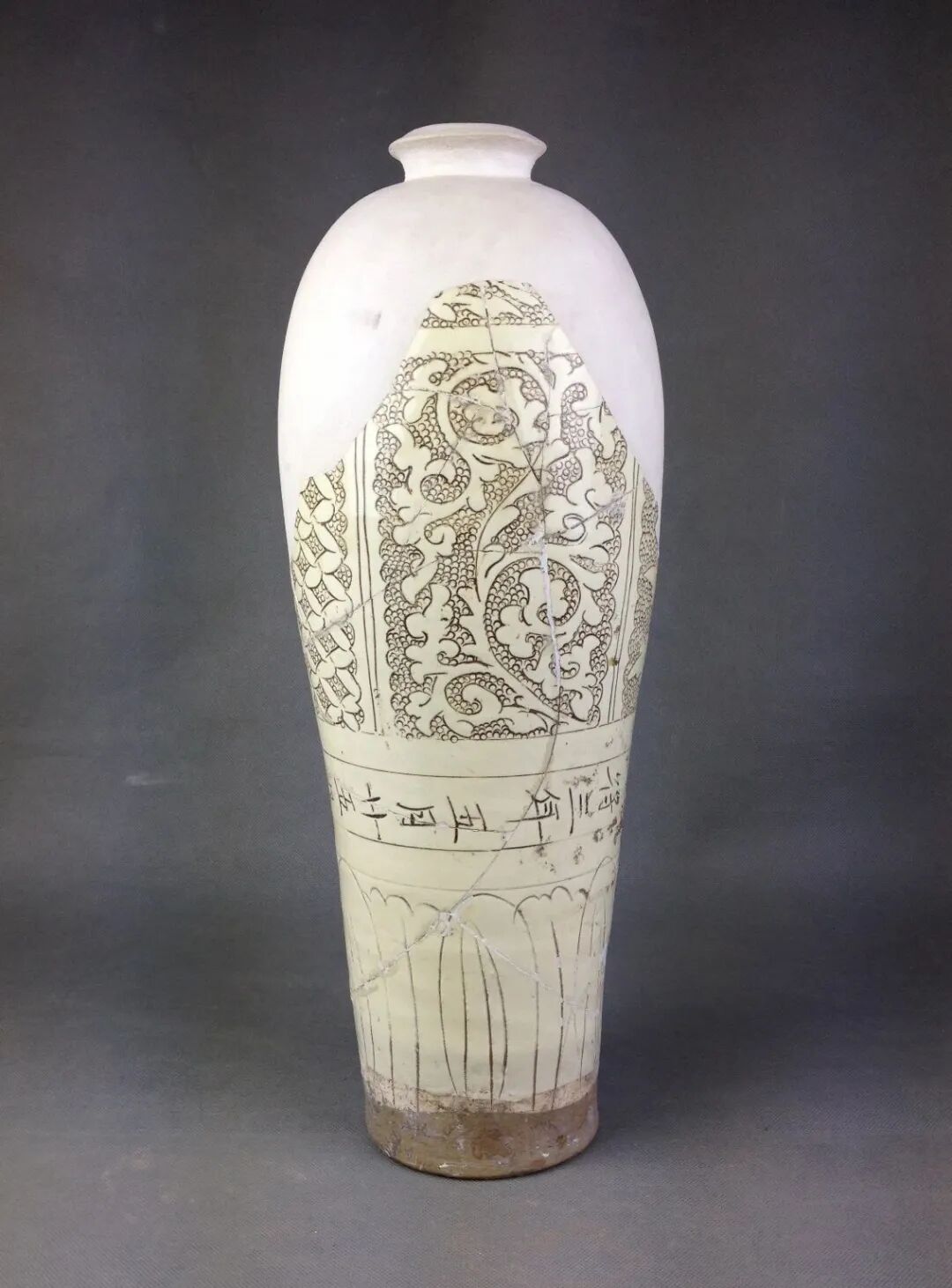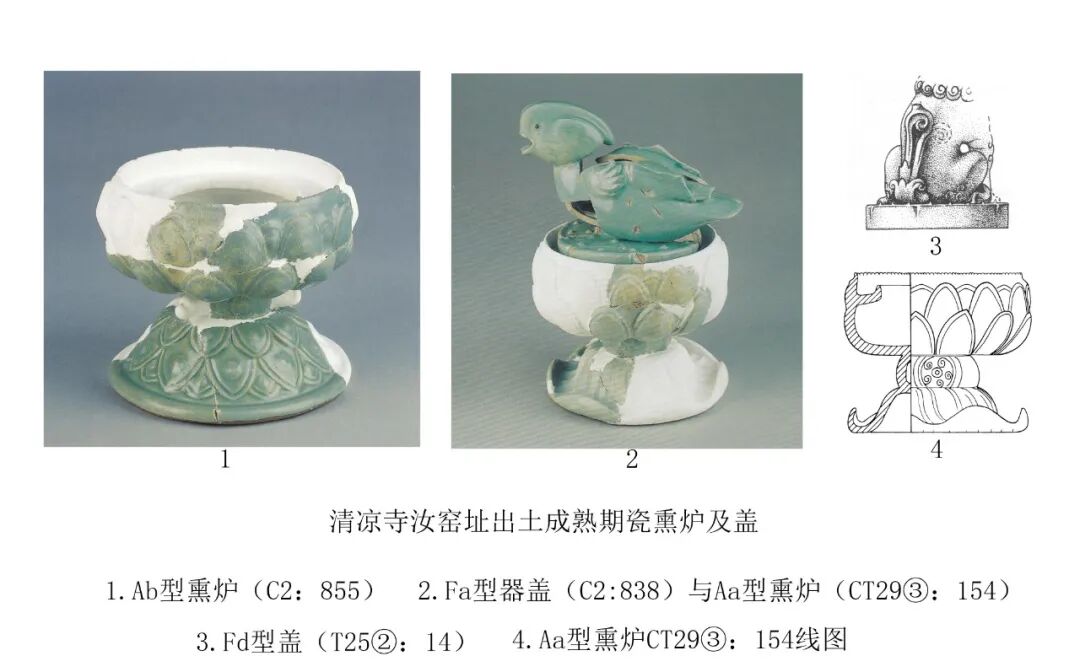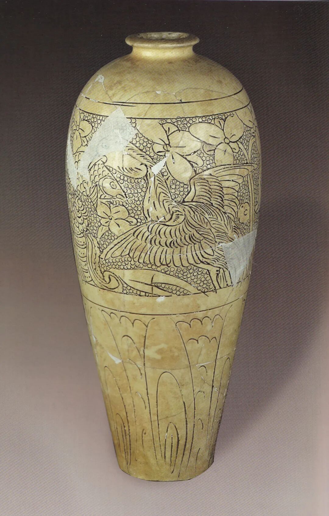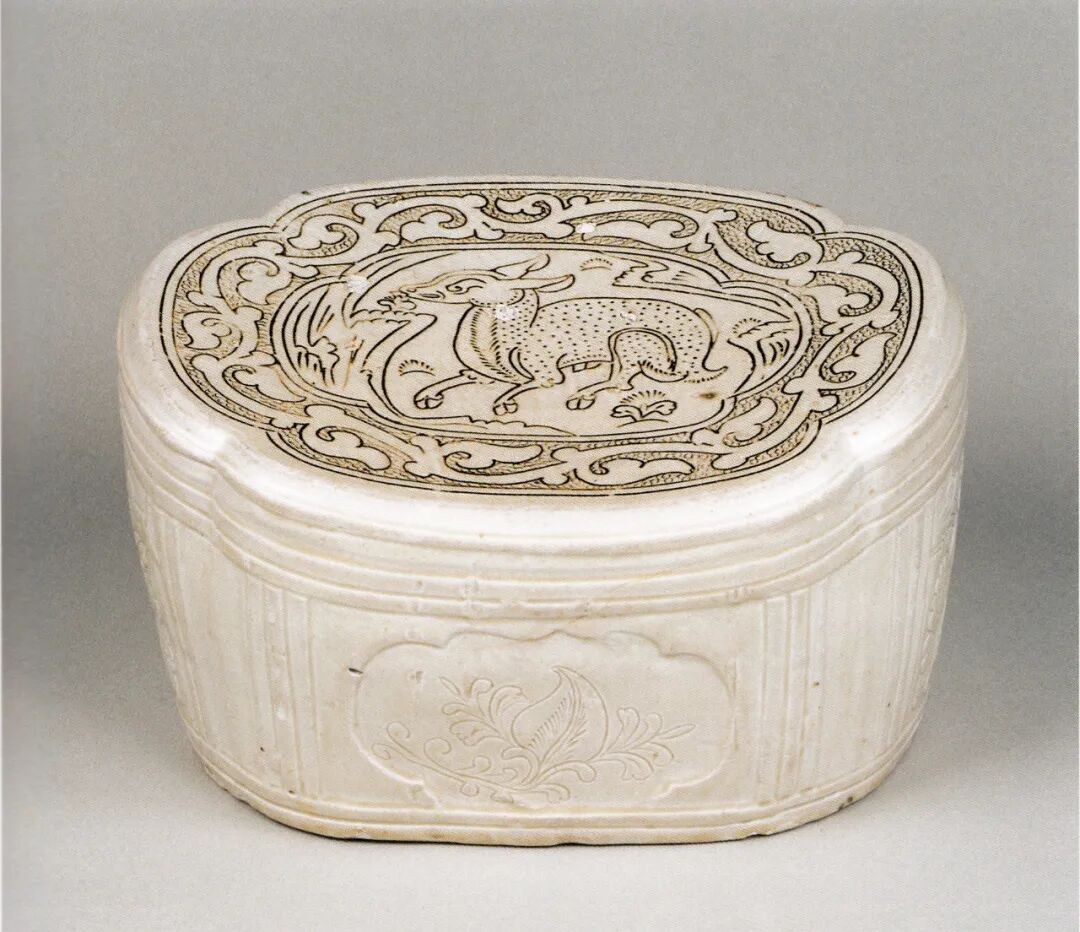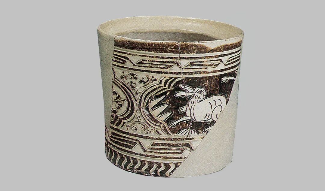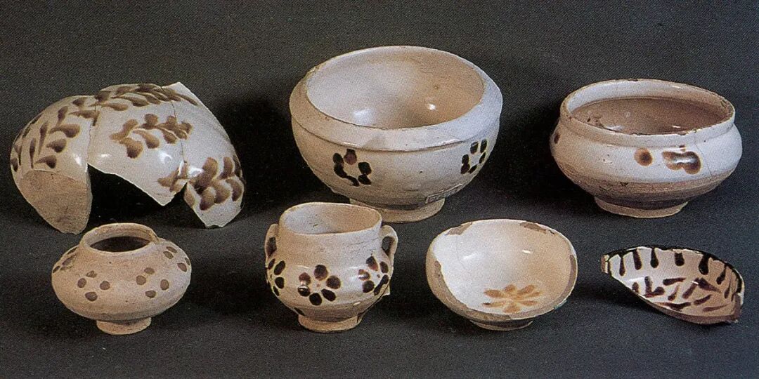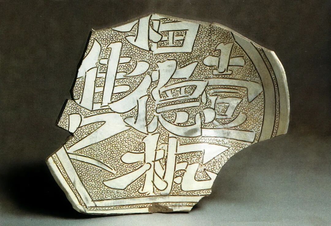 大英博物馆所藏的一件长方形枕就是此期的代表性器物[图十八]。2011至2016年,河南省文物考古研究院在天青色汝瓷生产区范围的周边地区(第Ⅳ区)发掘出一些质量上乘的珍珠地划花瓷器,时代从北宋晚期到金代早期[图十九]。也恰恰在这一时期,高丽青瓷的镶嵌工艺也萌发了,并且在初创时期以单色的线镶嵌纹饰出现,与汝窑的珍珠地划花装饰有密切的关联。图十九:2015年发掘清凉寺窑址IV区出土北宋末金初珍珠地划花梅瓶定窑一带主要是在河南地区和磁州窑的影响下生产珍珠地划花瓷器的。最有特点的是在河南和磁州地区的影响下,流行填彩的戳印纹器物[图二十]。其生产的时间主要是金代后期。应该也对高丽镶嵌青瓷的出现和发展产生了较为直接的影响。珍珠地划花瓷器在工艺上有两项重要的贡献:第一,在器物上的相关部分施用斑花彩料,这是首次使用特殊的高铁彩料,施加于器物的釉下,高温一次烧成。第二,在划纹内填彩的工艺使器物的花纹精美、鲜艳,又不似金银镶嵌细工那样复杂费工,得到了迅速的发展和传播。特别应指出的是,珍珠地划花填彩工艺,几乎在其创制之始,也同步应用于单纯的划花装饰和戳印纹上。河南地区较早在单独的划花纹饰中填彩,例如新密西关窑出土的五代到北宋早期的划花填彩宝相花纹枕片[图二十一]。划线内填白彩的工艺是在珍珠地划花装饰的影响下产生的,目前仅见于河南地区。美国克里夫兰美术馆藏一件北宋前期的划花填白彩梅瓶就是典型代表。由于器物胎色很深,在肩、腹部形成的白彩的花纹,十分明快清新[图二十二][23]。该瓶是河南登封白沙窑的产品[24],在该窑址出土过许多类似的标本[图二十三],如一件元宝形瓷枕的残件,枕面有戳印填白彩的鸟纹[图二十四][25],鸟纹以大片的白彩表达,其工艺技术基本就是高丽镶嵌青瓷中的所谓“面象嵌”技艺。