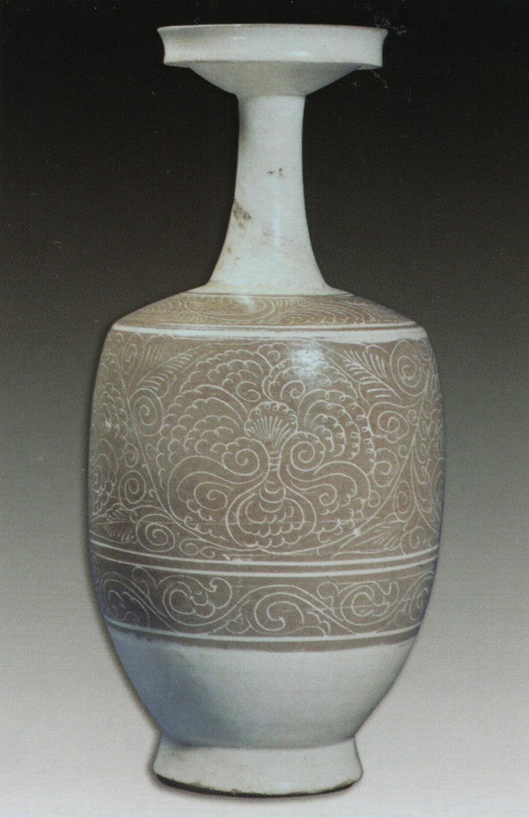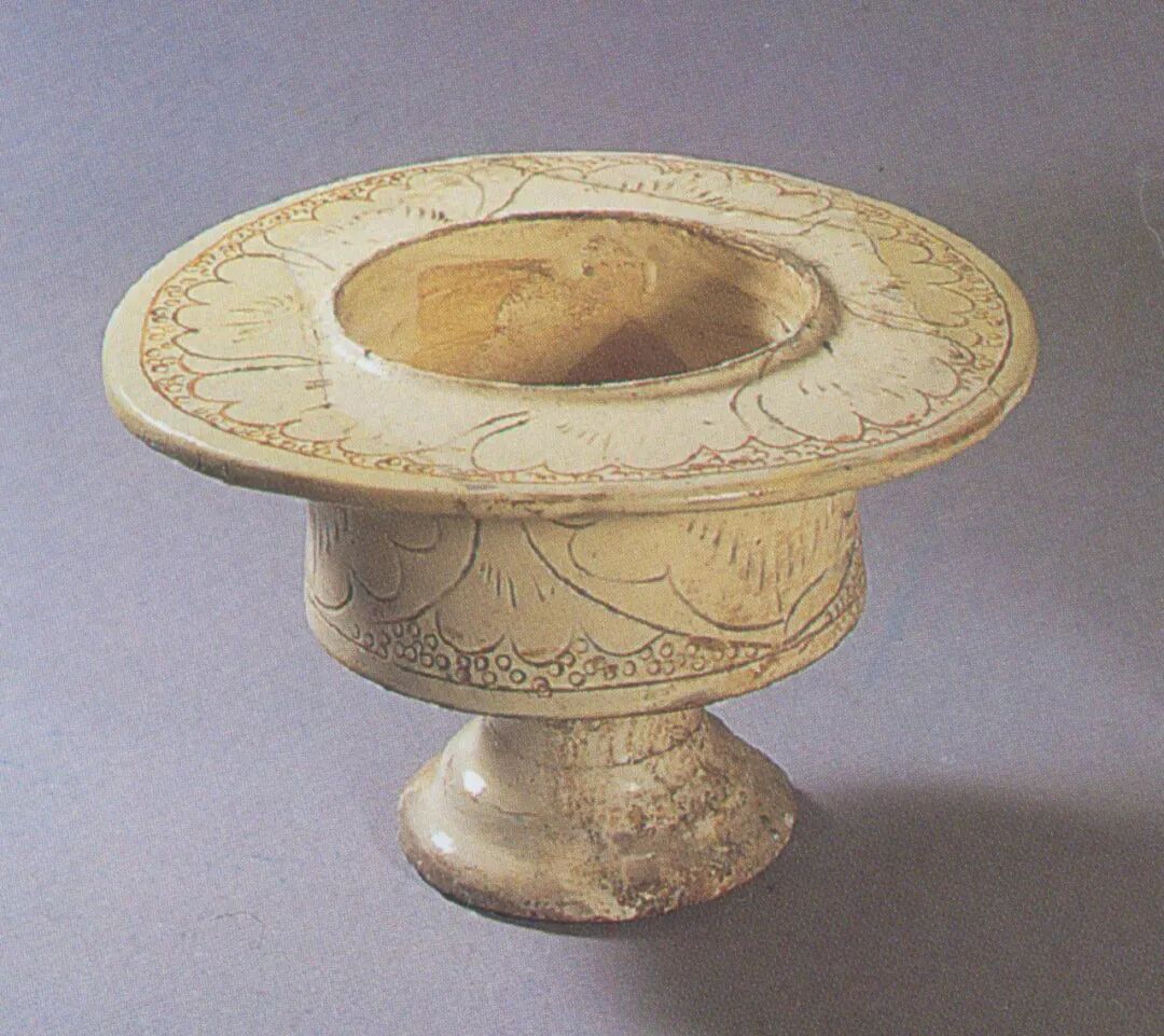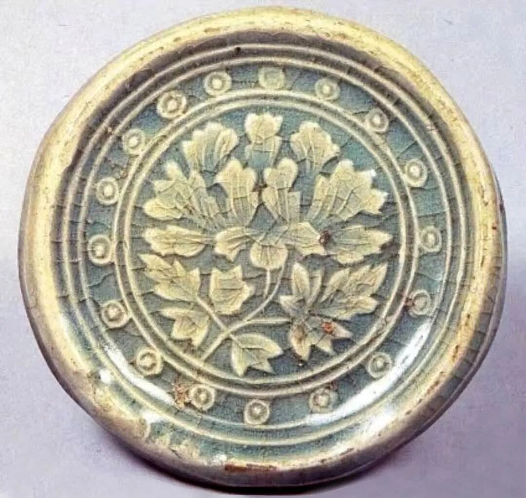 综上所述,高丽镶嵌青瓷产生于12世纪中叶,一直流行至14世纪晚期。镶嵌青瓷的一项关键技术是在刻、划、印、剔装饰的沟槽和减地部分填彩,中国北方地区早在高丽镶嵌青瓷出现前两个世纪时就已创始,并且持续发展,有珍珠地划花、白釉划花嵌白彩、黑剔花刻填、青瓷镶嵌等种类。珍珠地划花装饰是在用划线勾画出来的图案以外,用管状工具在主体花纹以外戳印小圆圈,使花纹以外形成布满小圆圈的地纹。珍珠地划花瓷器是其生产期间各窑场中的精品,也是中国北方瓷器诸多装饰手法中最具装饰效果的技法之一。因此尽管制作起来较困难且费工,但传播得较快,影响广远。目前,发现生产珍珠地划花瓷器的窑场主要分布在中原北方地区。根据现有的各种资料,生产珍珠地划花瓷器的窑场有20余处,都是当时生产水平较高、规模较大的窑场。据最新的考古发掘材料可知,珍珠地划花装饰产生于五代末期到北宋初,下限是金代后期。其发展大约可分为三个阶段。早期阶段,即10世纪后半叶或稍早。工艺较原始,新密西关窑的珍珠纹排列得较乱,珠圈较小,划纹内不填彩或只有部分填彩[图十四]。中期阶段,约从988年到1068年。这一阶段是珍珠地划花装饰的成熟发展时期[图十五],不仅生产区域扩大,也对其他的装饰技法产生了影响,后面将论及的几种装饰都是在珍珠地划花装饰的影响下产生的。晚期阶段,即神宗朝以后。珍珠地划花装饰达到了全面的繁荣[图十六,图十七],一直延续到金代前期,随后迅速的消亡,仅在山西地区持续生产。![]()