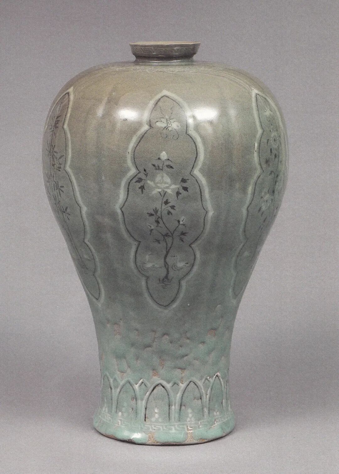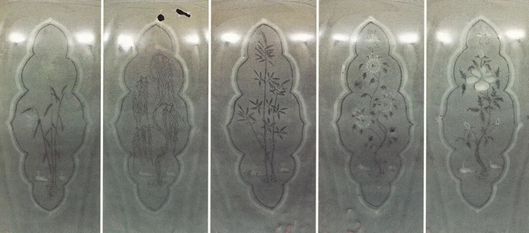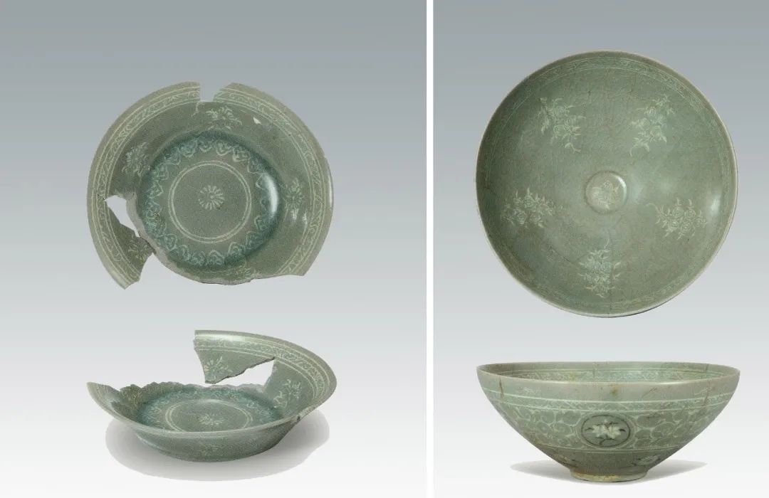 在划纹、印痕和剔刻形成的凹陷部填彩,所用的彩料一种是当时常用的白色化妆土;另一种是含铁量很高的铁矿石彩料,中国北方地区的窑工称之为“斑花”,用于画黑彩。镶嵌技术使用的关键是如何将彩料填入粗细不等、复杂多变的纹饰当中,与金属器上的镶嵌工艺和掐丝工艺有明显的不同。在器物表面施一层浅淡透明的玻璃质青釉,这种釉在镶嵌工艺出现以前就已成熟了[图四],釉的颜色基本上不影响花纹的呈色。关于高丽镶嵌青瓷产生的时代,目前尚有不同的看法。目前所知最早的较可靠的证据是出土于高丽明宗智陵中的镶嵌青瓷碗、盘[图五],属于13世纪前半叶。此外还有高丽熙宗硕陵(1237年)出土的多件镶嵌青瓷[图六],马岛2号沉船出水的镶嵌青瓷梅瓶也属于13世纪前半叶。![]()