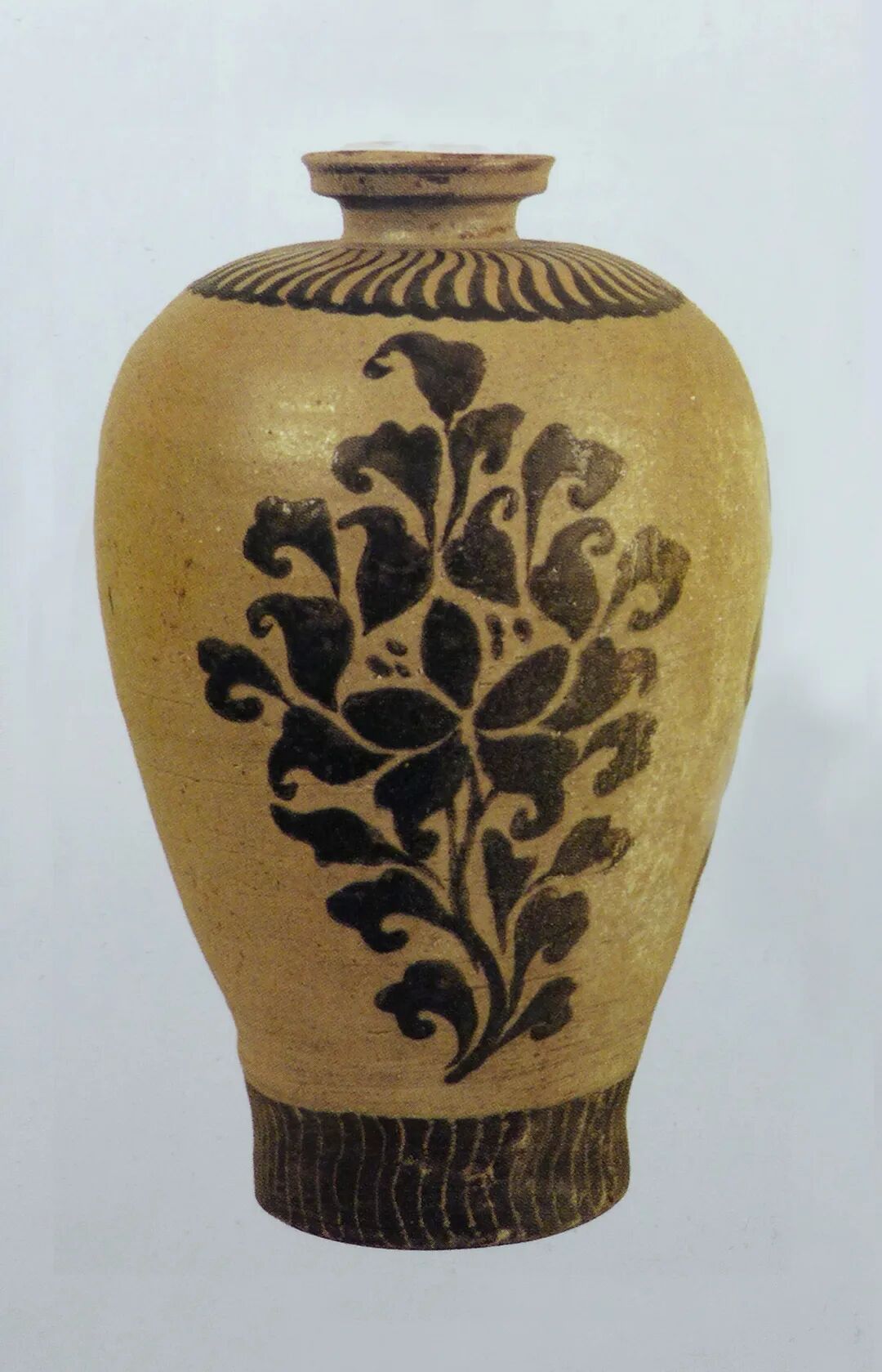 这种纹饰在宋代首先出现于河南中西部地区。北宋后期在磁州窑成为最流行的纹饰,金代仍十分流行[图三十],定窑地区也十分流行,只是时间稍晚,从北宋后期至金代。由此可见,高丽镶嵌青瓷在其发展的早期阶段,主要的纹饰都与中原北方地区北宋末到金代流行的纹样相似或相同,具有明显的传承关系,只是在其发展阶段以后,才逐渐形成了自身独特的纹饰风格。有学者认为,高丽镶嵌青瓷是模仿高丽流行的嵌银丝铜器而创制的。然而用瓷器工艺模仿其他手工业品,是瓷器初创时期的特点。而当制瓷业本身发展成熟后,就会开创适合于瓷器本身的装饰技法和纹饰。高丽的制瓷业至北宋末期已达到了成熟的阶段,学习嵌银丝铜器而开创一种新的装饰工艺有许多不合理之处:① 据徐兢所记:“燕饮之礼……器皿多以涂金或银,以青瓷为贵”[33],青瓷比鎏金镀银器还贵重,未必需要去仿金银铜器。② 12世纪并非高丽金银铜器生产的盛期,并没有一个大环境促使制瓷业去仿金铜制品。③ 大中祥符八年(1015年)出使宋朝的郭元在介绍高丽王朝时曰:“民家器皿,悉铜为之”表明高丽并不缺铜,用瓷器仿铜器缺少动因。11世纪后半叶到12世纪是高丽青瓷快速发展的时期,其发展的动力主要来源于仿制中国以都城开封为中心的北方地区制瓷业成就。高丽纯青瓷在器具的品种和造型的选用上明显的与中国北方的汝窑[图三十一]、耀州窑相关,而比镶嵌青瓷稍早产生的青釉黑彩绘画的“铁画青瓷”[图三十二]则与磁州窑的白地黑花装饰密切相关[图三十三]。