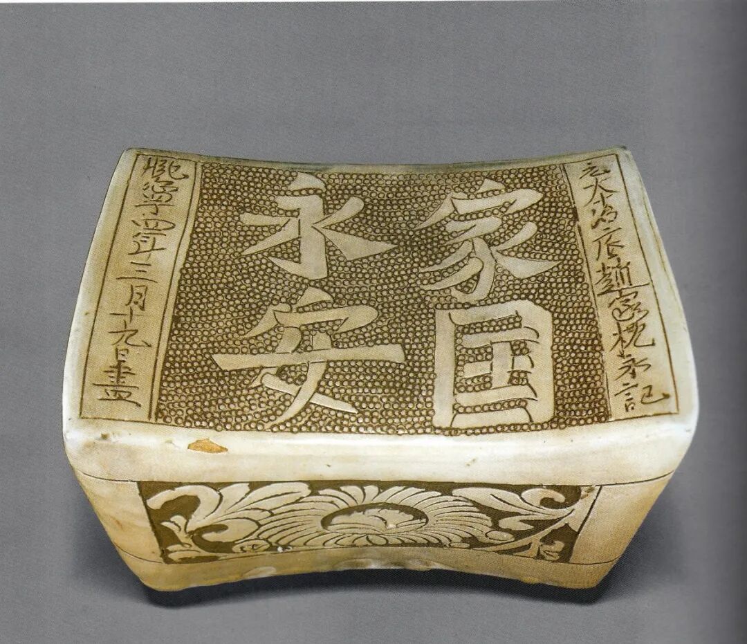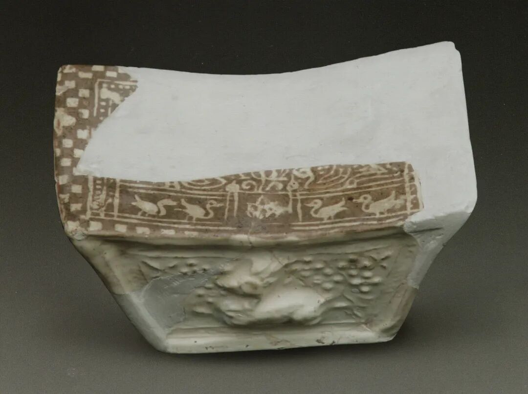 图二十四:登封白沙窑址出土白釉戳印嵌白彩鸟纹元宝形瓷枕
