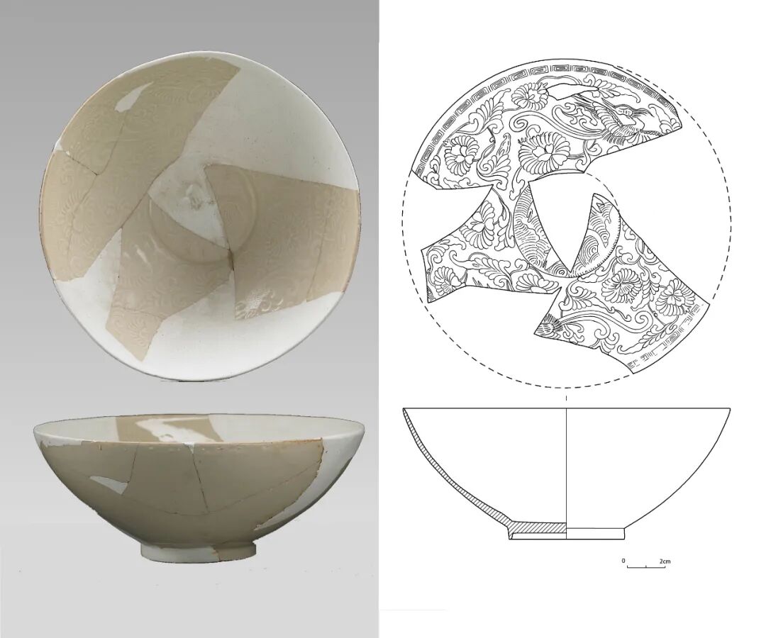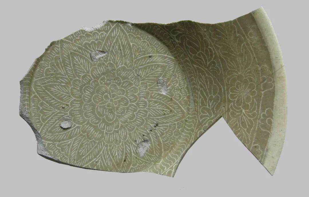 这类器物与前述白釉划花嵌白彩的装饰在工艺上基本相同,只是最后在器表施青釉而不是透明釉。1997年山西省考古研究所发掘浑源界庄窑址辽晚期到金前期地层中出土了许多这种镶嵌青瓷标本[图二十七][28]。这类瓷器的生产源于河南中西部地区的白釉划花填白彩装饰,经焦作地区的窑场传到了耀州窑和山西地区。耀州窑和雁北的辽窑将其创造性地应用于青瓷器上。图二十七:1997年发掘浑圆界桩窑出土青釉嵌白彩折腰盘中原地区在花纹中填彩的工艺兴起于五代至北宋初期,到北宋中后期时已相当发达,宋末金初达到了极盛,成为北方地区众多装饰技法中较重要的一类。产生于12世纪中叶的高丽镶嵌青瓷,受到中原地区镶嵌工艺的影响,是十分可能的。关于高丽镶嵌青瓷与中国北方采用镶嵌装饰工艺瓷器的联系,有以下几点需要强调:高丽镶嵌青瓷产生初期主要采用单色镶嵌,并且都是在划线纹内嵌彩的“线镶嵌”。而同期中国的单色镶嵌瓷器已相当成熟,从工艺发展到扩张的规律考虑,二者的影响、传播朝向是不言自明的。高丽镶嵌青瓷在其发展的主要阶段具有相当独特的纹饰题材,看上去与中国北方地区瓷器的纹饰有较明显差别。然而在高丽镶嵌青瓷的初创时期,其纹饰与中国北方地区纹饰有诸多相似之处。如崔淳雨指出的可能早到12世纪前期的镶嵌青瓷雷纹碗(参见[图九])上的雷纹实际上是一种由磁州窑流行的连续回纹变形而来的曲带纹,是北宋末至金代磁州窑十分流行的纹样。而定窑在金代后期特别流行这种纹饰,成为金代定窑瓷器的标志性边饰纹样[图二十八]。图二十八:2009年发掘定窑遗址出土的金代后期EI型白釉印花碗另外,高丽镶嵌青瓷上非常流行一种
