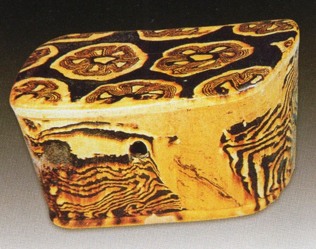状的戳印星纹,正是北方地区流传有序并十分流行的装饰。在河南巩义大、小黄冶唐代三彩窑址中就发现了这种用蓝、白、绿等彩点画的五点或六点星状纹[图二十九]。图二十九:黄釉绞胎枕