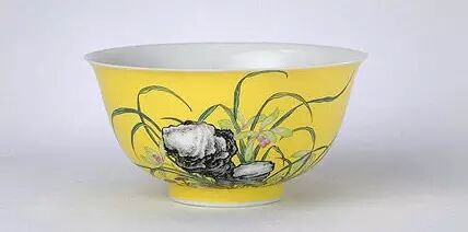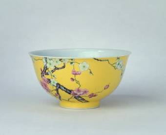 以花鸟人物为装饰题材的雍正斗彩,釉下青花勾线,釉上填绘各种色彩,均填彩准确,不出边线。而且瓷器装饰追求色彩的变化,在一朵花内填以紫红黄绿青等多种色彩,制作工艺已经相当成熟。清雍正黄地珐琅彩梅花纹碗