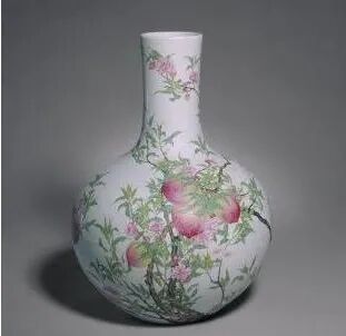 此时生产的瓷器产品中,小件器皿线条柔和含蓄、轻巧俊秀,实用而美观。大件器皿端庄典雅,讲究线条变化,质朴古拙、比例协调、轻盈秀丽、规整而不厚重。清雍正粉彩蟠桃纹天球瓶