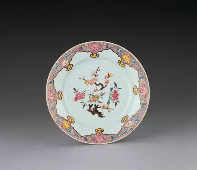 粉彩(将五彩的各种色彩加入一种白色彩料玻璃白)的出现,改变了色料的性能。绘瓷工人利用渲染的手法,绘出比五彩更为精确、真实,色彩更加丰富的画面,因此粉彩被称为我国传统彩瓷中瑰丽的晚霞。雍正 粉彩描金花卉纹盘
