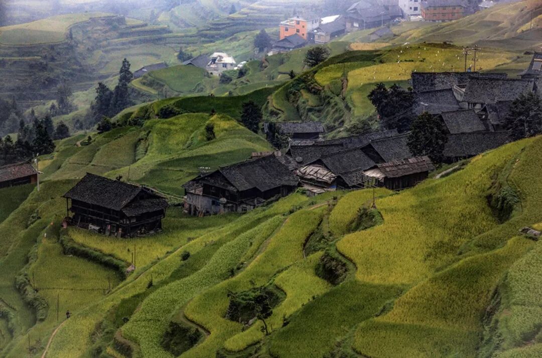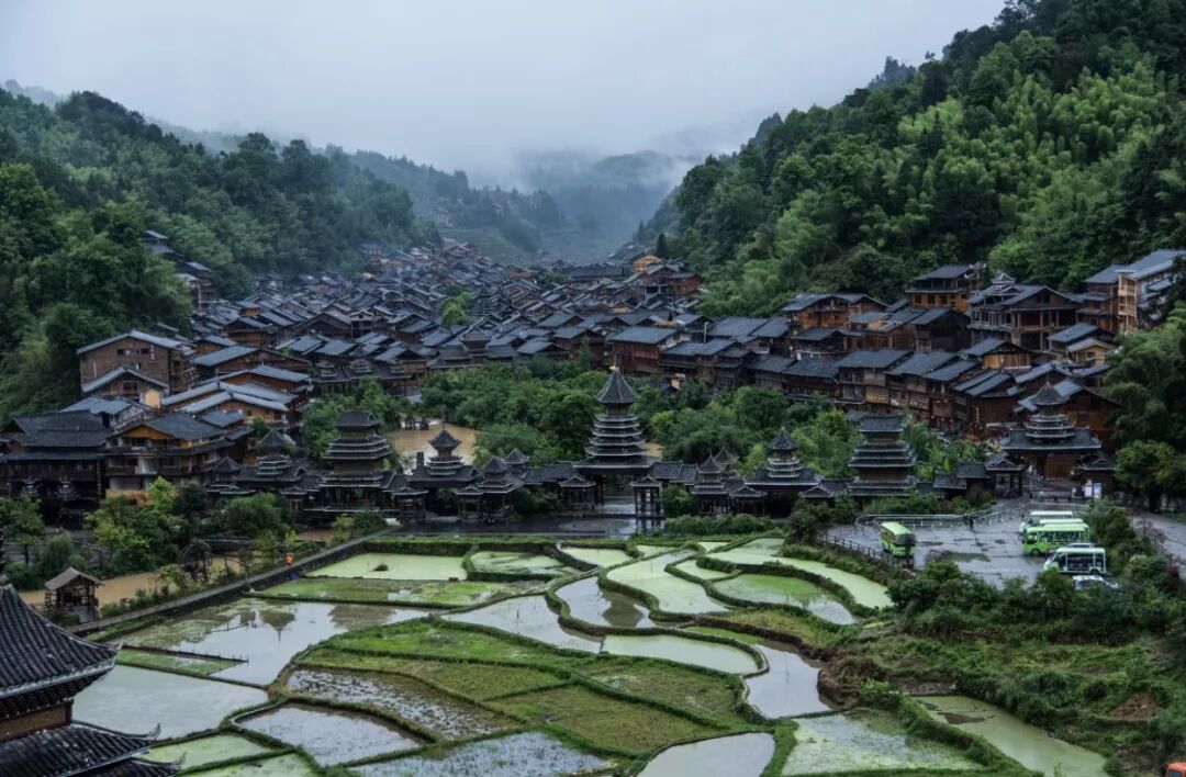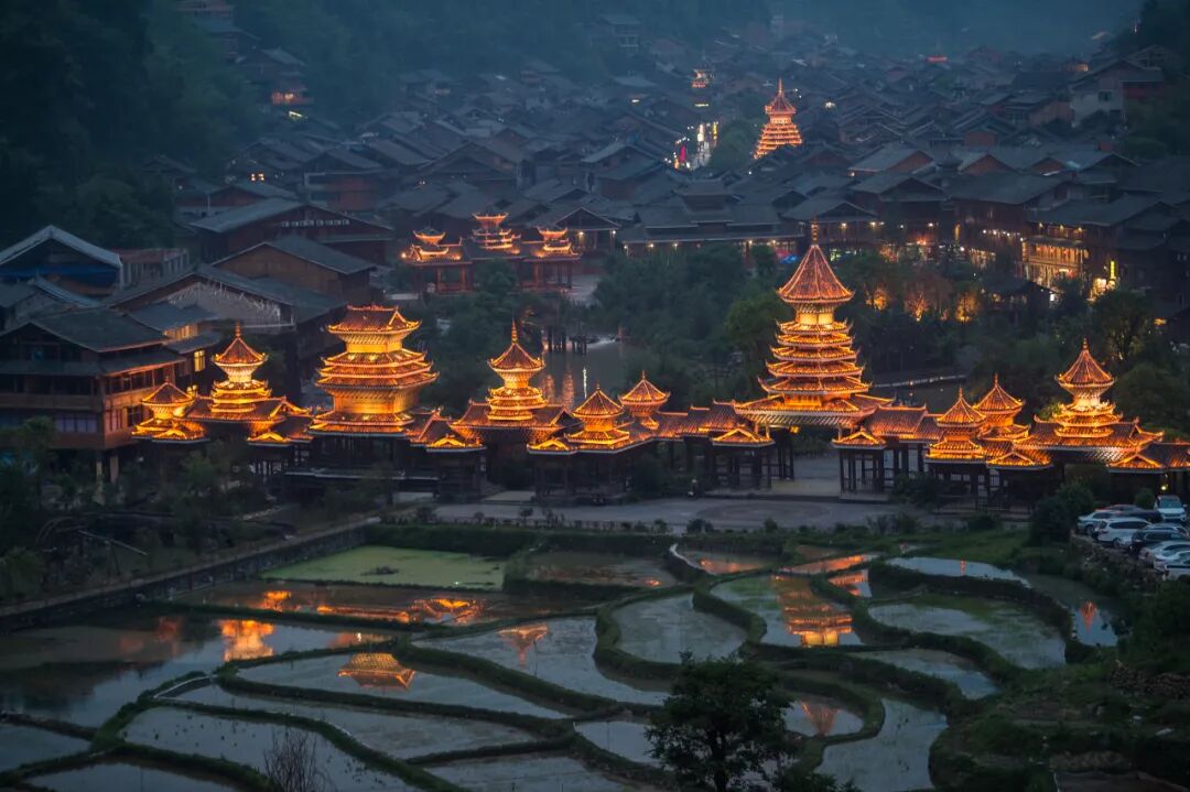 肇兴侗寨,坐落在高山环抱里的肇兴侗寨,是全世界最大而又最古老的侗寨。四面重峦叠嶂,全寨茂林修竹,层层叠叠的侗家吊脚楼,依着山势,迤逦向上展开,楼边的流水清清浅浅。它也因此被《中国国家地理》杂志评为中国最美的乡村古镇。