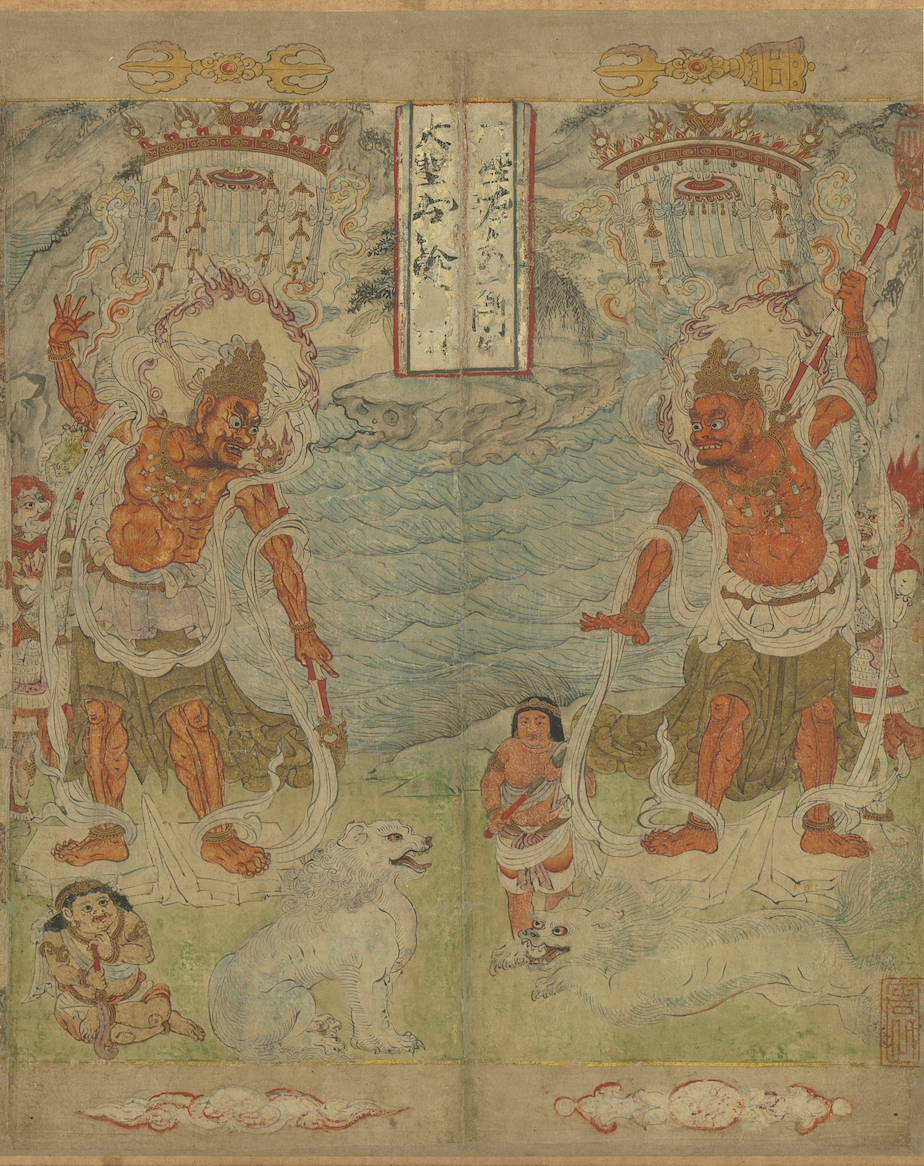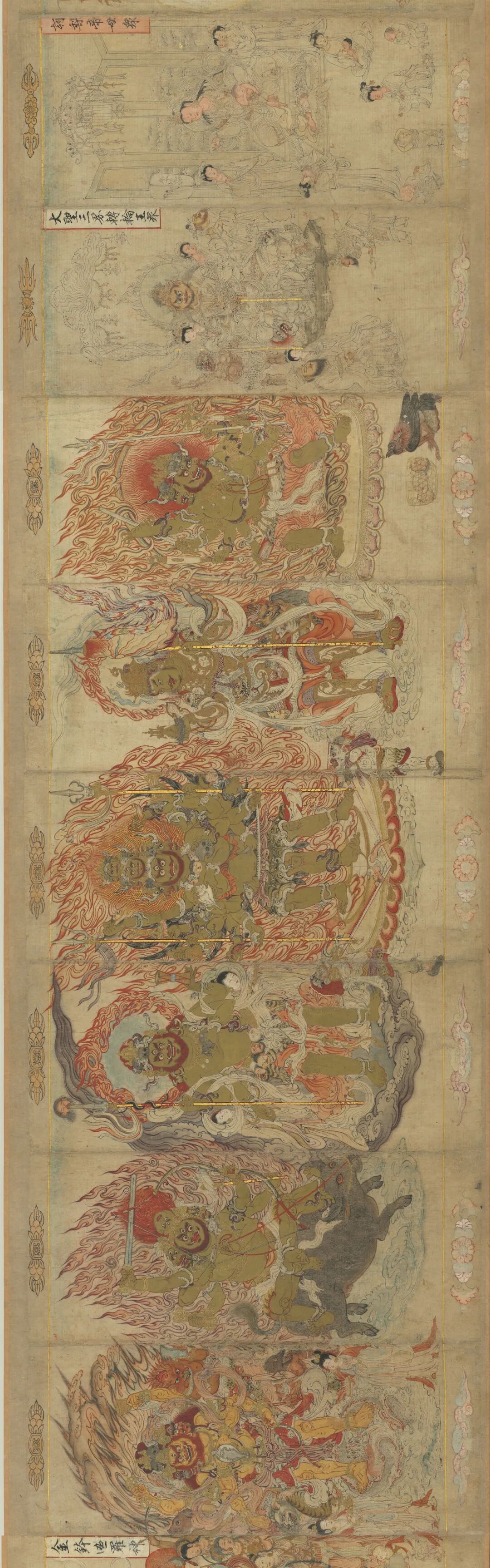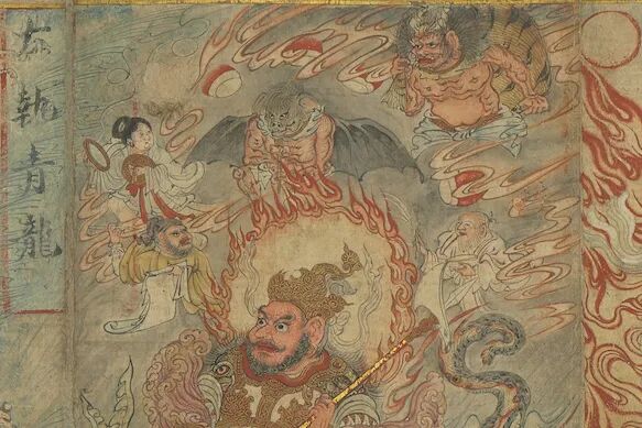 虎头人身、背生双翼,周围四面大鼓的,是雷神。雷神左手背负虎皮口袋的壮汉,为风伯。风伯下方右手持柳枝、左手捧钵(?)的老者,当为雨师。雷神右手,双手持金镜的女神是电神。电神下方,画着一文吏,愚疑心即“司命”,在佛画中自然得算作诸天之一。