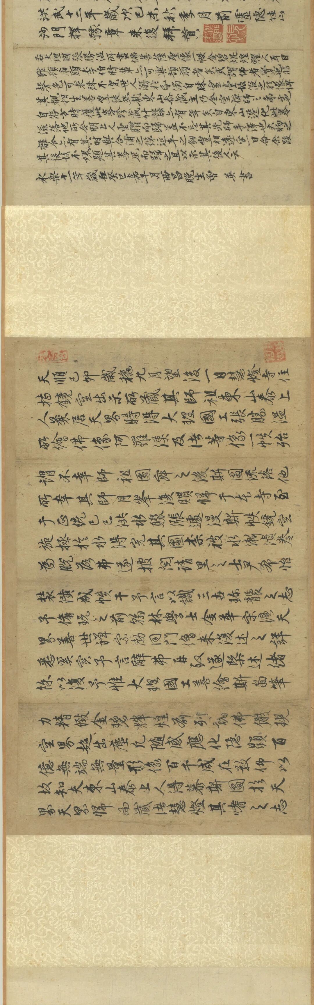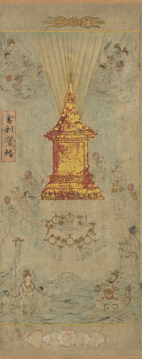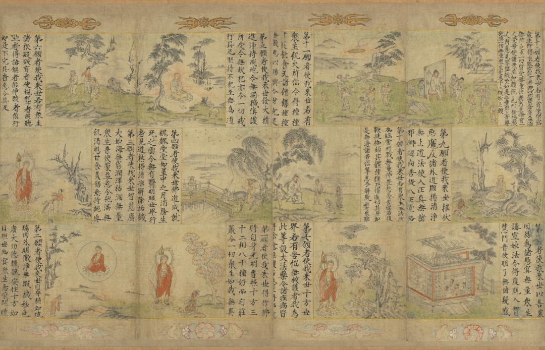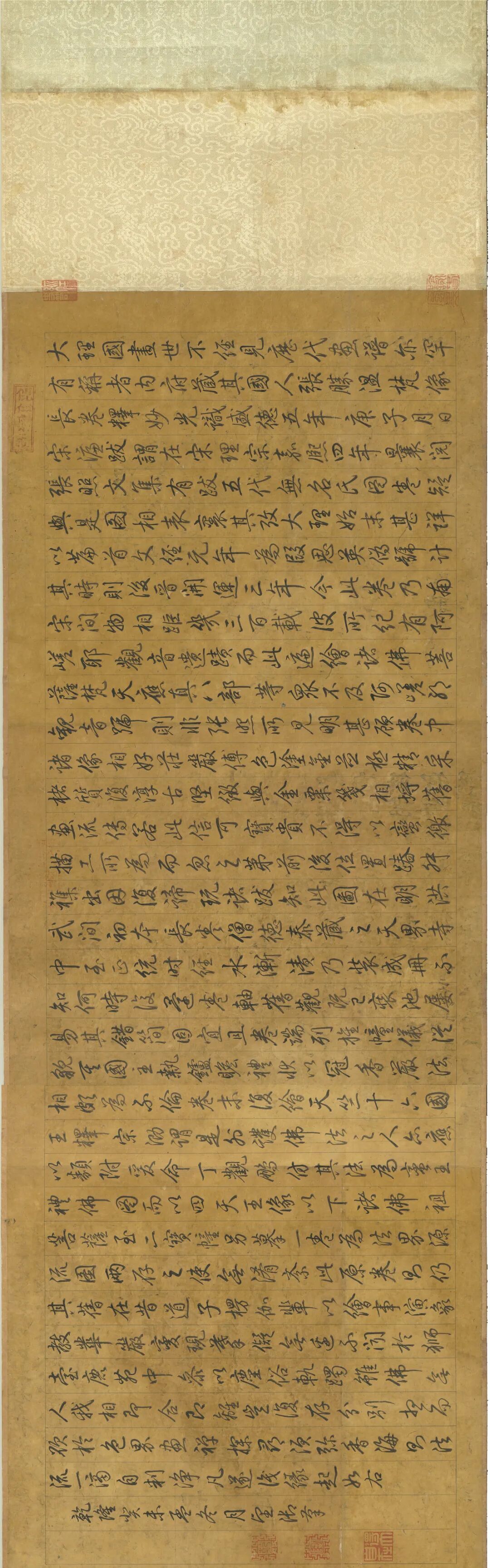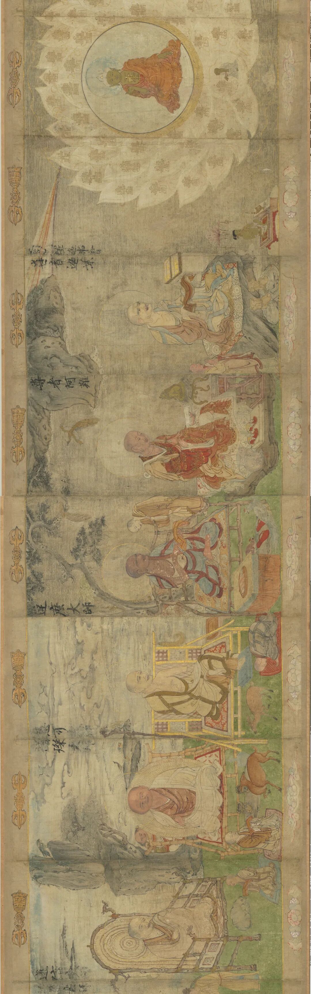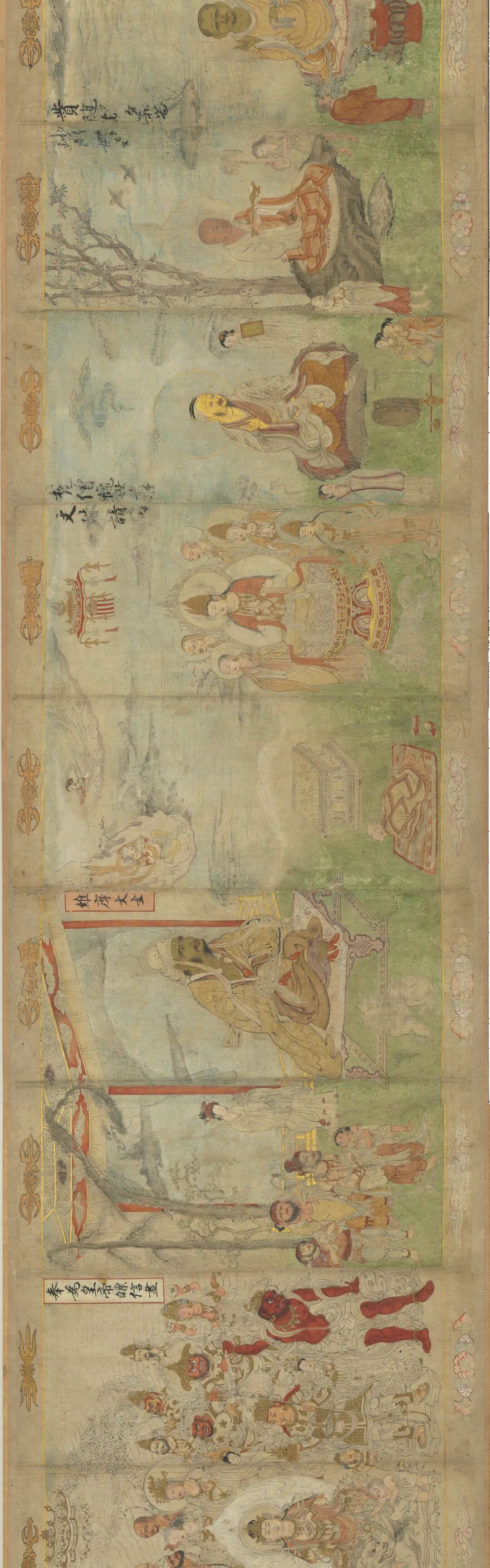 这幅横长五丈三尺(不计拖尾合16.35米)、纵高一尺(约0.305米)的长卷,首先是绘于楮纸上的设色画,其次是以想象中的庄严佛国为主题,目其为历史文献肯定不是画家本来意愿。