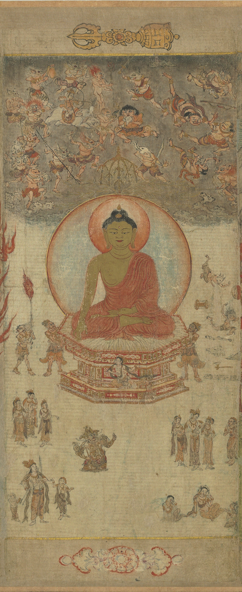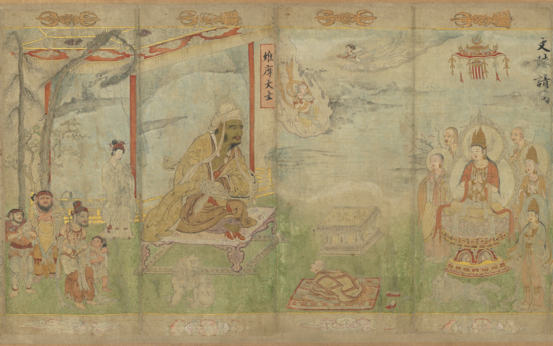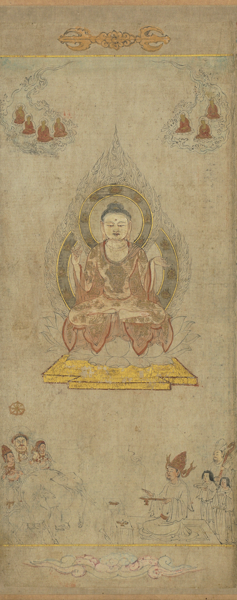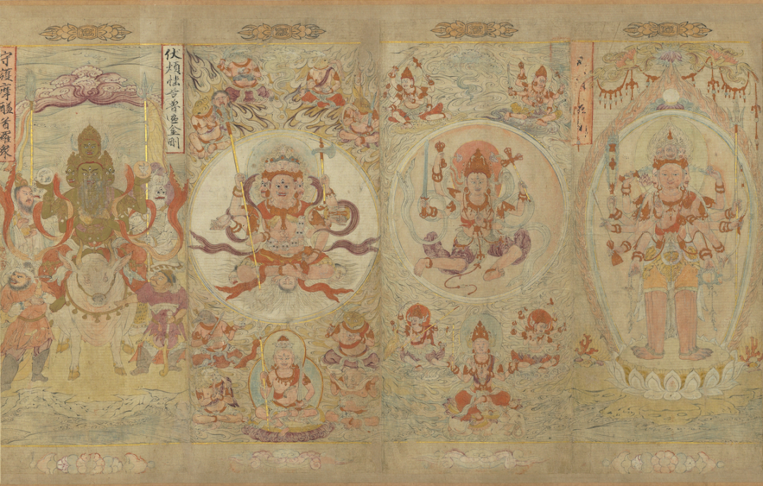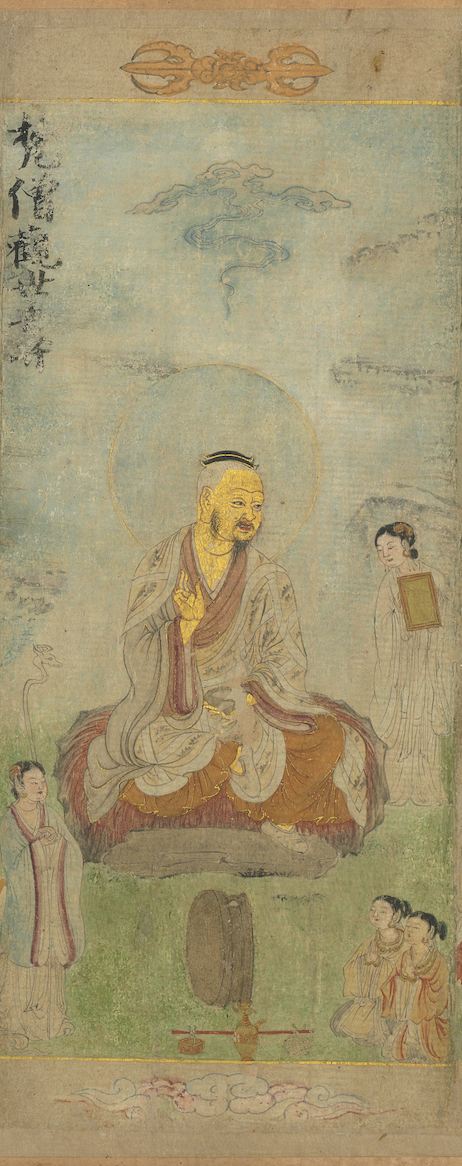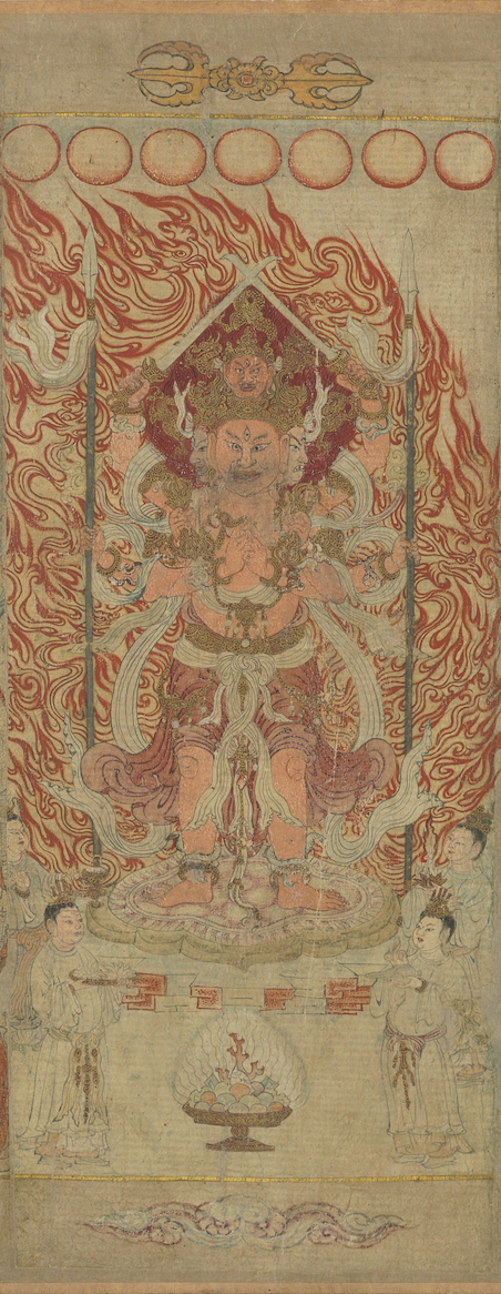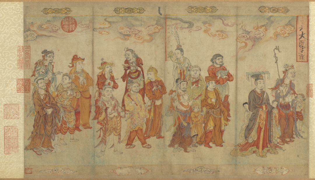 《梵像卷》第十一开,中心人物上方绘有五身神人。
