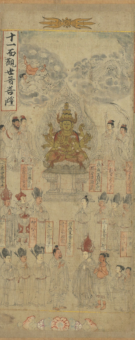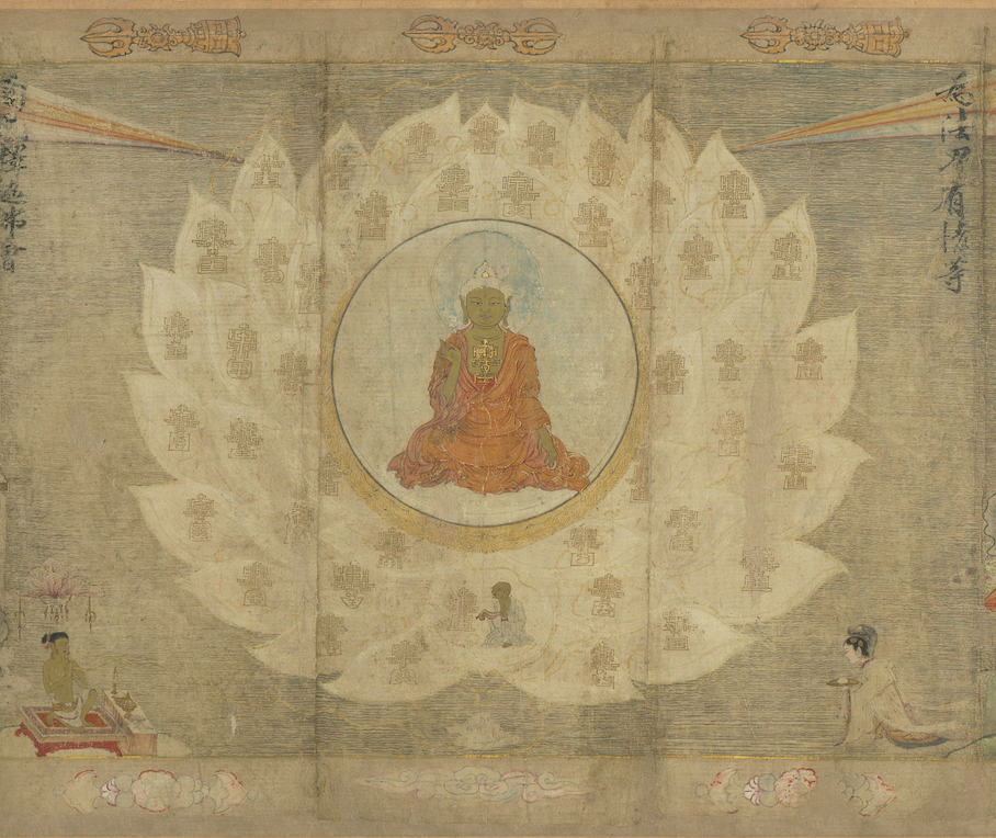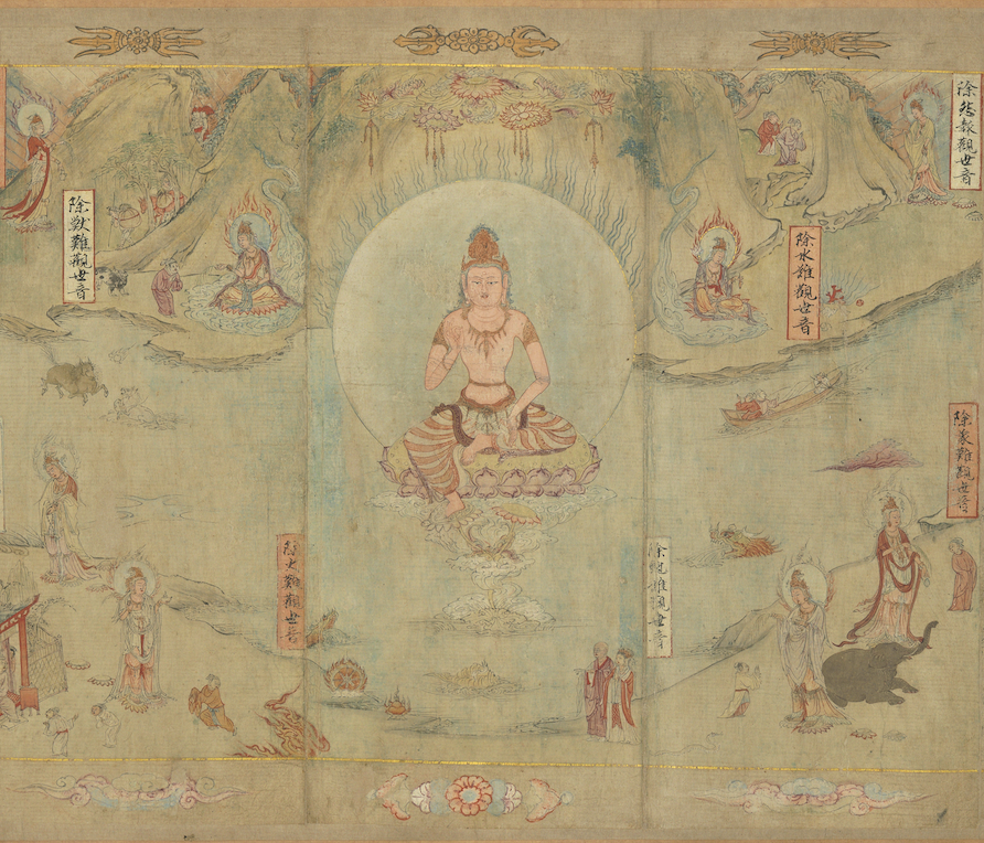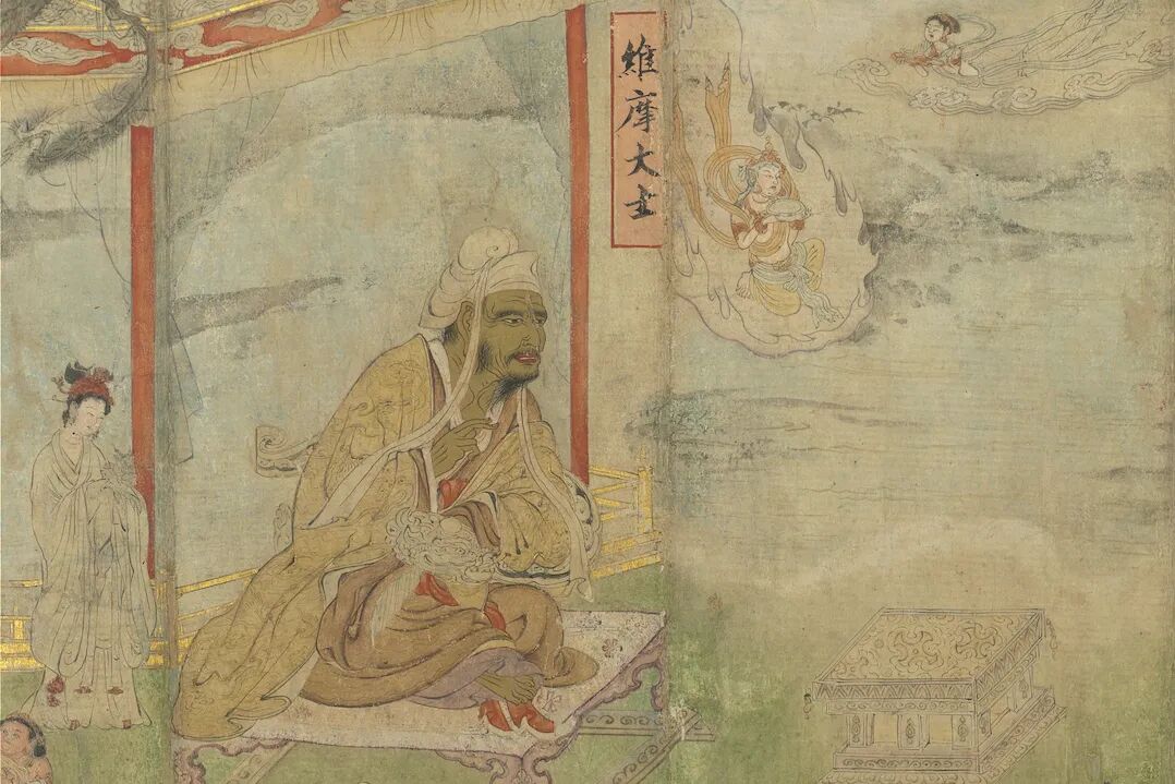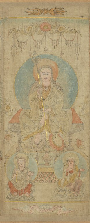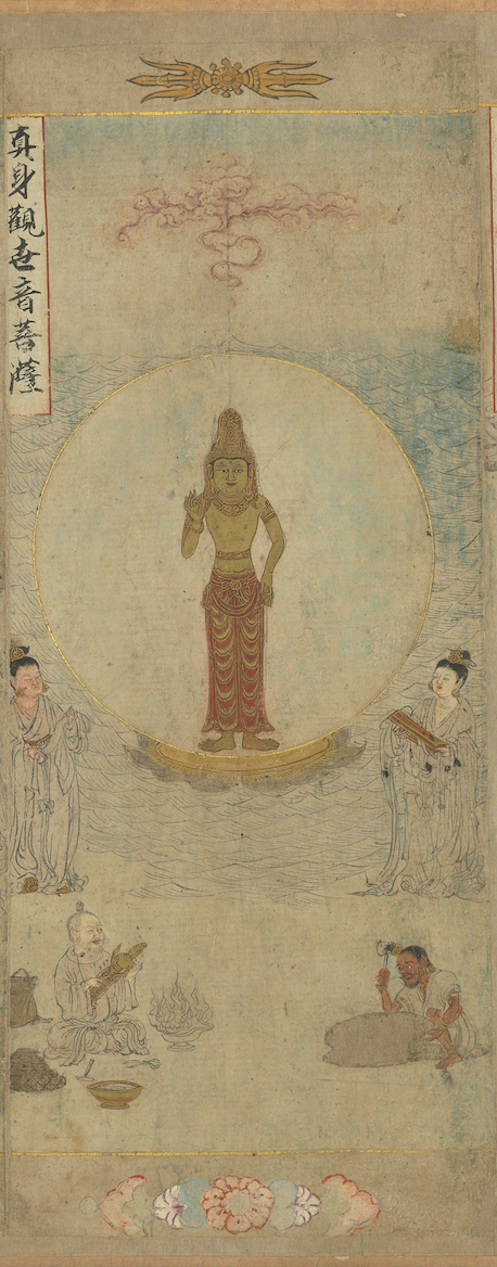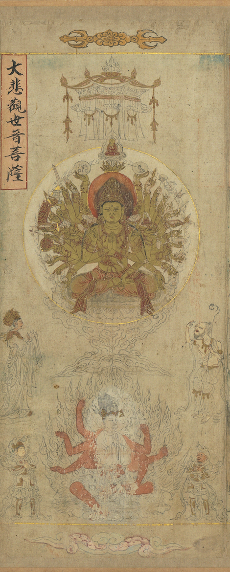 《梵像卷》第十一开,中心人物上方绘有五身神人。