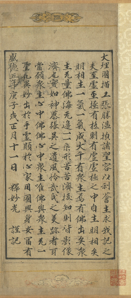 数天后,画卷呈在案头,释妙光和尚恭敬的写下跋语,“……张胜温描诸圣容,以利苍生,求我记之……妙出于手,灵显于心,家用国兴,身安富有,盛德五年(1180)庚子岁正月十一日”。