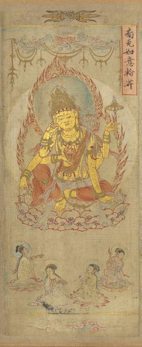 宋朝黄休复《益州名画录》,唐朝辛澄“普贤阁下五如来同坐一莲花,及邻壁小佛九身;阁里内如意轮菩萨,并澄之笔,见存”。五如来同坐一莲花,与《梵像卷》百零八开“南无秘密五普贤”的形象接近。
