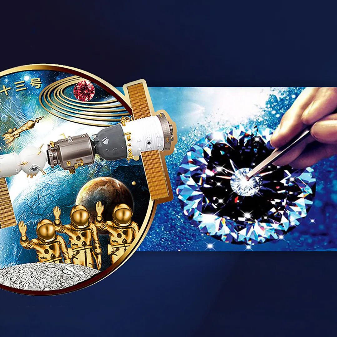 这枚纪念章有着深邃美丽的宇宙风采,长久保留神舟航天器完整形象,这无不得益于高超的“幻彩移印”技术,主体材质为黄铜镀黄金,采用大落差高浮雕工艺,镶嵌炫彩红色宝石,处处小细节,浓浓大情怀。