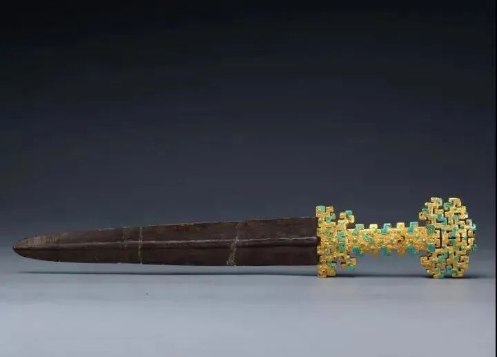 然而,这柄金柄铁剑最有价值的不是剑柄上的黄金和绿松石装饰,而是铁制剑身。透过当年发掘报告上的旧照,还能看出刚出土时,剑身上斑驳的铁锈。